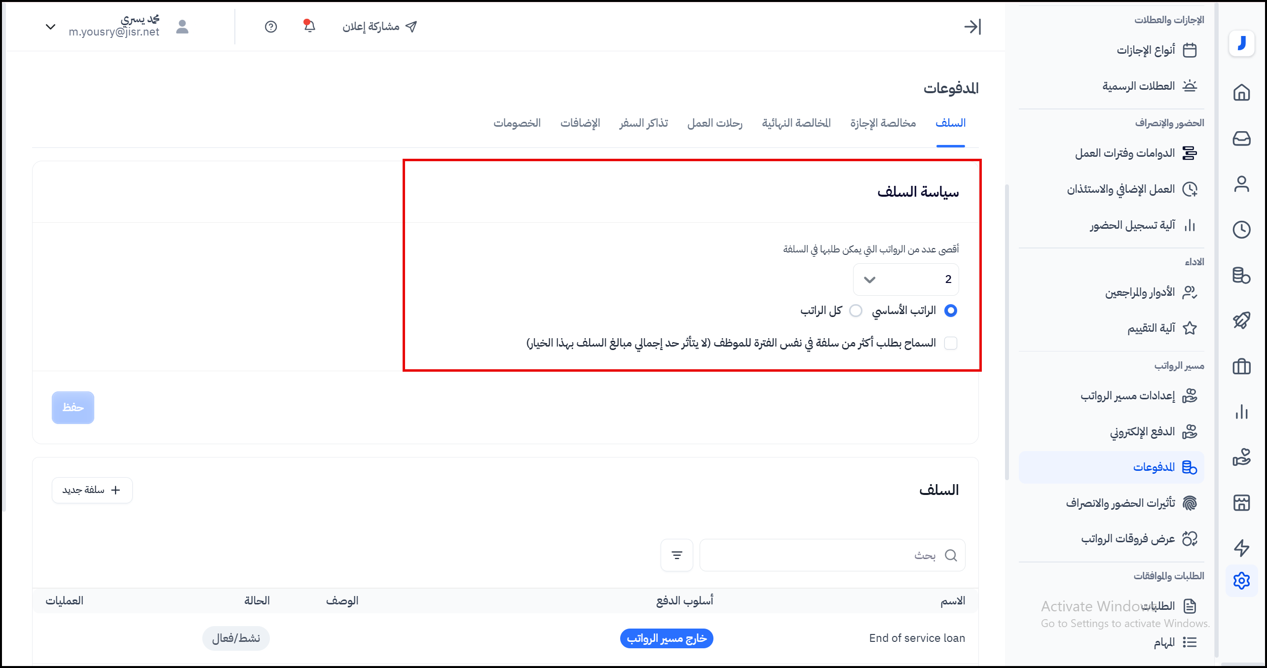 و بذلك فقد اكتمل إعداد سياسة السلف الخاصة بمنشأتك، لا تنسى الضغط على زر حفظ لتضمن إتاحتها لجميع الموظفين عند الرغبة في تقديم سلفة عن طريق جسر