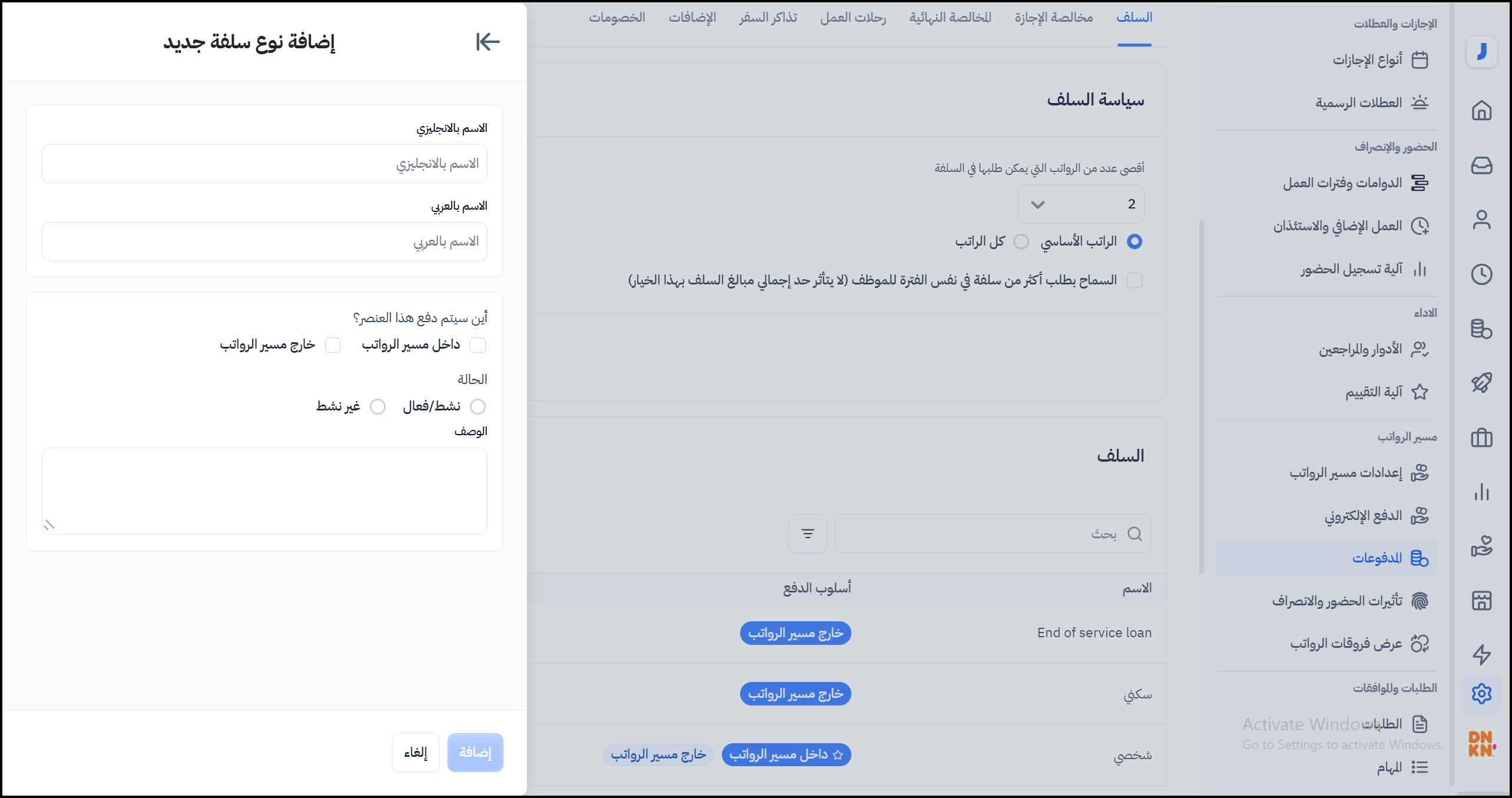 - حدد أسلوب وآلية انعكاس طريقة الدفع لهذا النوع من السلفة ( داخل مسير الرواتب أو خارج مسير الرواتب ، وقم بتعيين الافتراضي فيما يتعلق بآلية الاحتساب التي تتماشى مع سياسة المنشأة ).