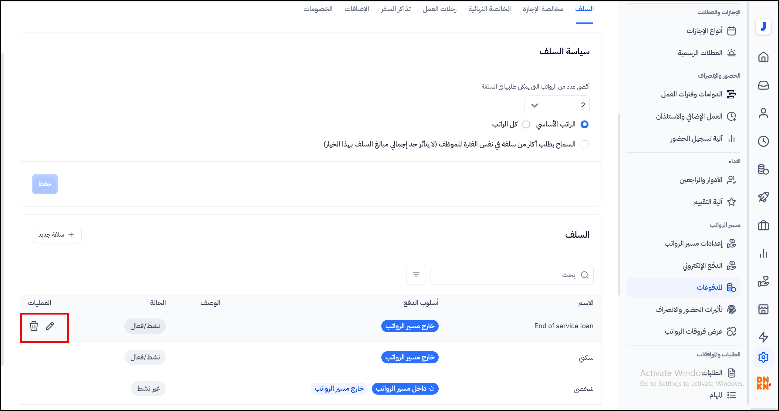 ⚠️ لا يمكن حذف نوع سلفة تم إضافتها مسبقا في حال وجود سجلات أو طلبات سلف تعتمد عليها ، وبالتالي ننصح بتغيير حالتها إلى غير نشطة.