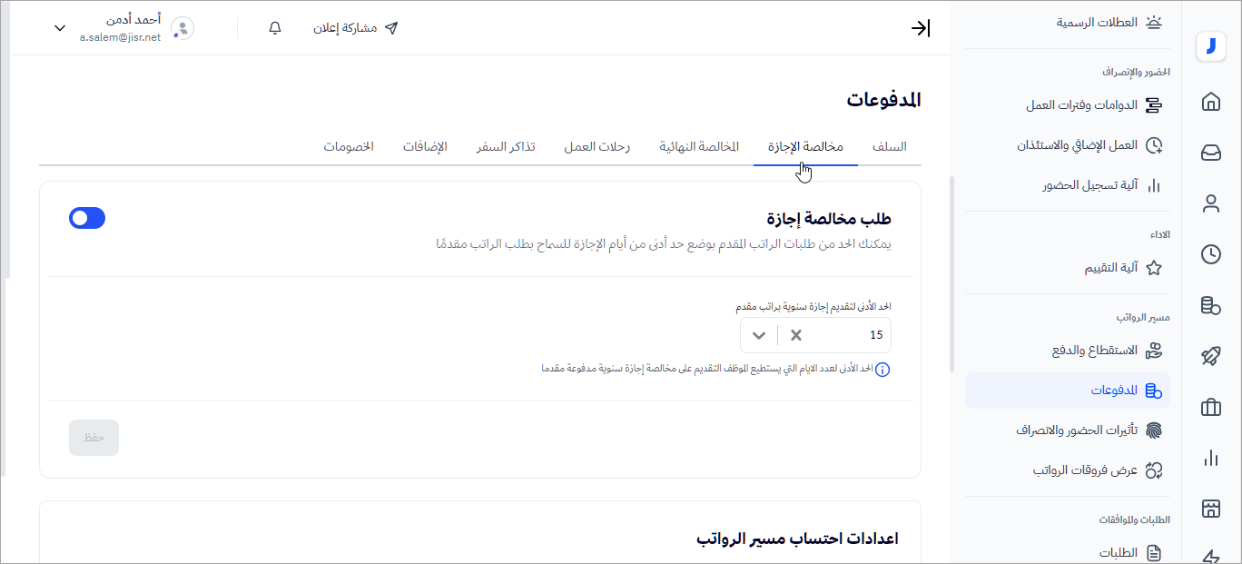 تفعيل إعدادات طلب راتب الإجازة مقدما :