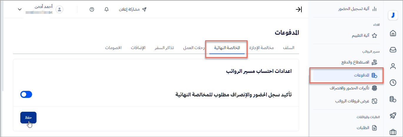 إذا كانت سياسة المنشأة تتطلب مراجعة و اعتماد كشف الحضور للموظف ، وبالتالي تطبيق خصميات الحضور والإنصراف على المخالصة النهائية الخاصة بالموظف ، فلابد من تفعيل الخيار الخاص بذلك ، من خلال الذهاب إلى صفحة الإعدادات > مسير الرواتب > المدفوعات > المخالصة النهائية > إعدادات احتساب مسير الرواتب > تأكيد سجل الحضور والإنصراف مطلوب للمخالصة النهائية > ثم النقر على زر التفعيل.