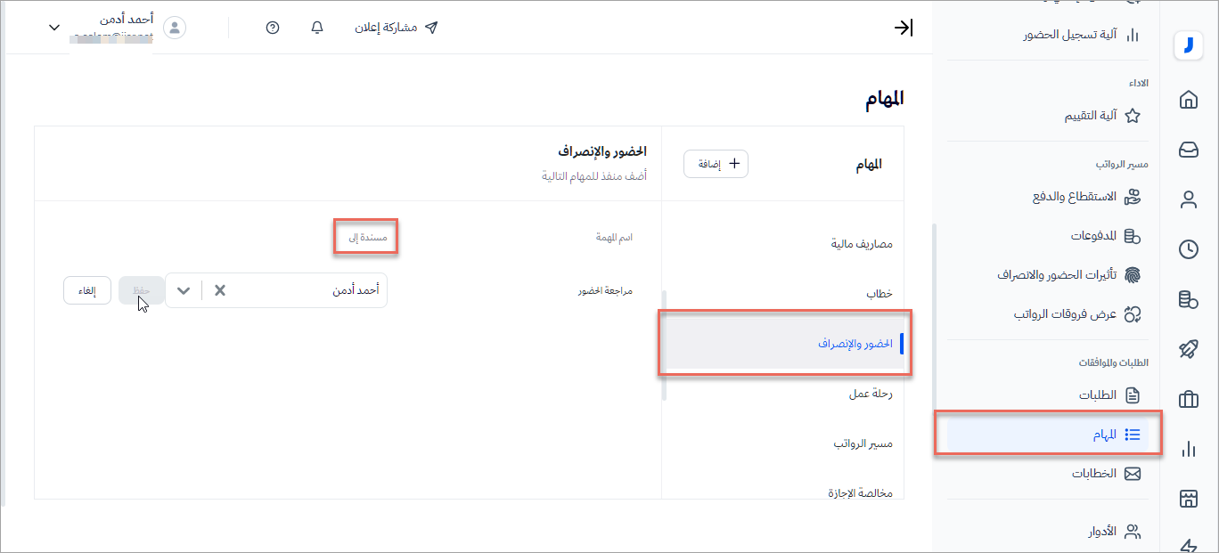 - مع التنويه الى انه يلزم إسناد مهمة مراجعة واعتماد كشف الحضور والانصراف للشخص المختص ، من خلال الذهاب إلى ( الإعدادات > المهام > الحضور والانصراف > مسندة إلى ).