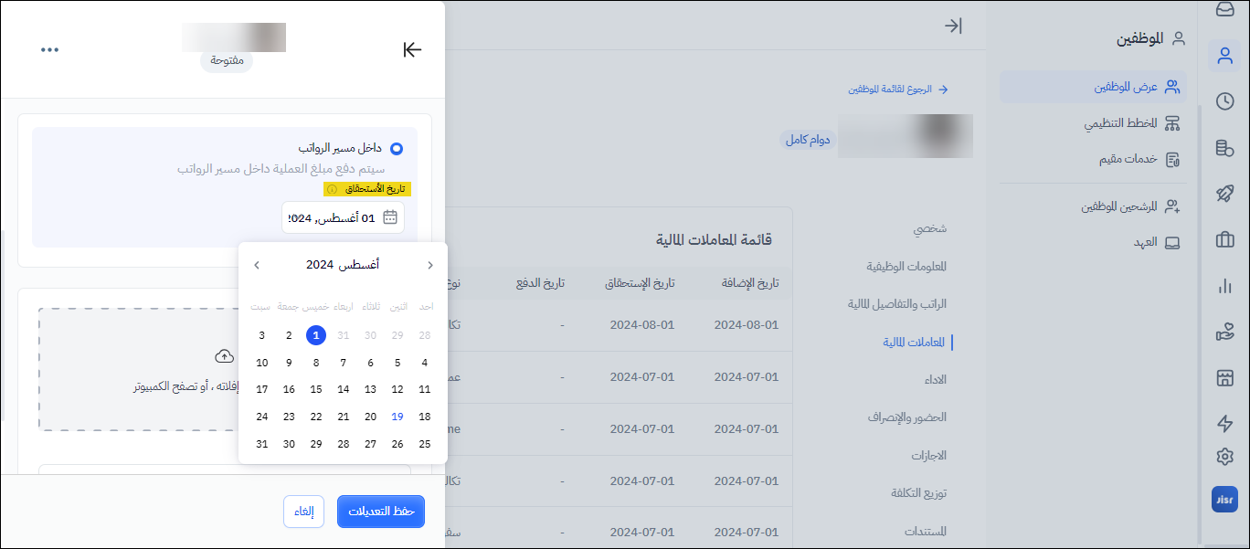 في حال كانت سياسة الدفع أو التعويض للموظفين لطلبات مهمة العمل للمنشأة تتم ( داخل مسير الرواتب ) ، فيلزم التحقق من تاريخ الدفع المستحق ( تاريخ الاستحقاق ) لهذه المطالبة من تبويب المعاملات المالية في ملف الموظف ، لضمان نزول مبلغ المخالصة ضمن مسير الرواتب المطلوب دفعها فيه ، أو إعادة جدولتها لشهر آخر إن تطلب الأمر.