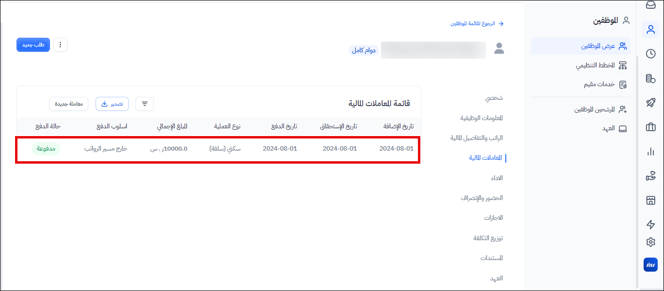 وبعد الإنتهاء من تأكيد مسير الرواتب ، وتأكيد تاريخ الدفع من صفحة تحويل الرواتب ، سيقوم النظام بتحديث حالة الدفع لهذه المعاملة بشكل تلقائي في تبويب المعاملات المالية ضمن ملف الموظف الشخصي.