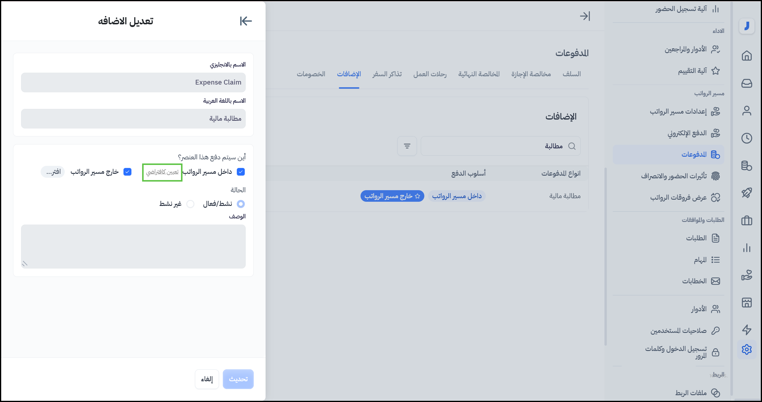 الإعدادات > مسير الرواتب > تبويب المدفوعات > تبويب الإضافات > مطالبة مالية > تعيين أين سيتم دفع هذا العنصر بشكل افتراضي.