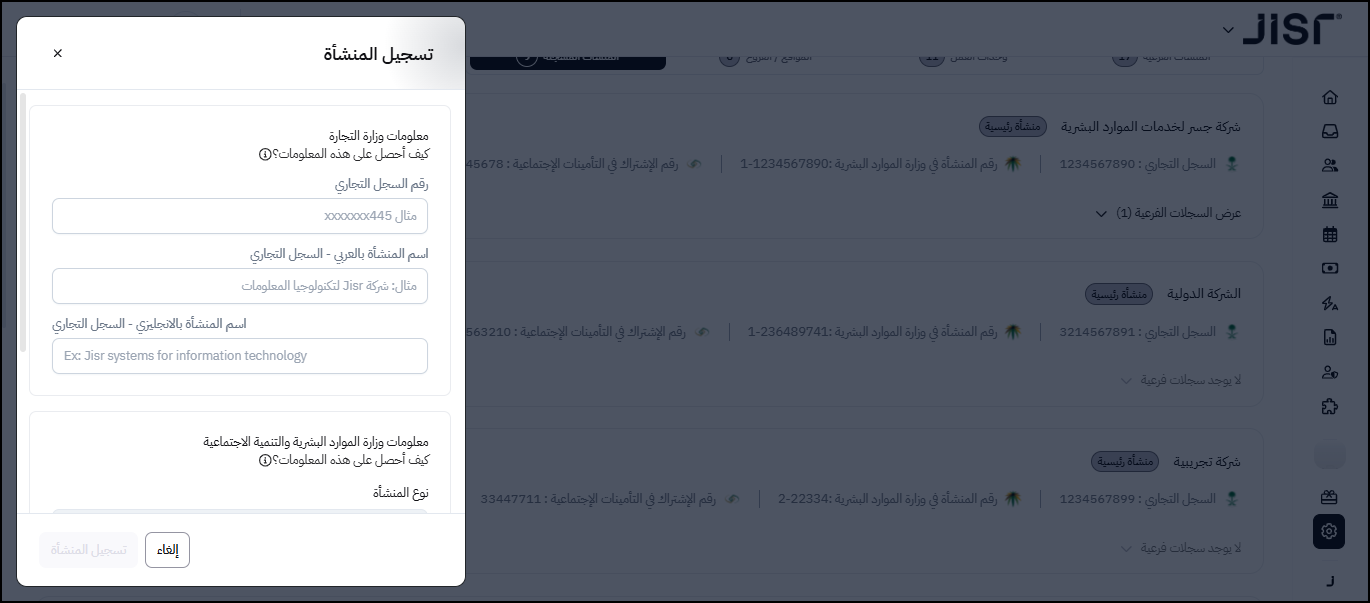 يلزم إضافة بيانات هذه السجلات أولا على النظام ، وكذلك تعريف رقم مكتب العمل ، ورقم إشتراك المنشأة في التأمينات الإجتماعية لكل سجل ، ومن ثم تعريف رقم الآيبان البنكي ، وإسم البنك المخصص لدفع الرواتب لكل سجل ، وأخيرا رفع ملفات المشتركين في التأمينات الإجتماعية لكل سجل .
