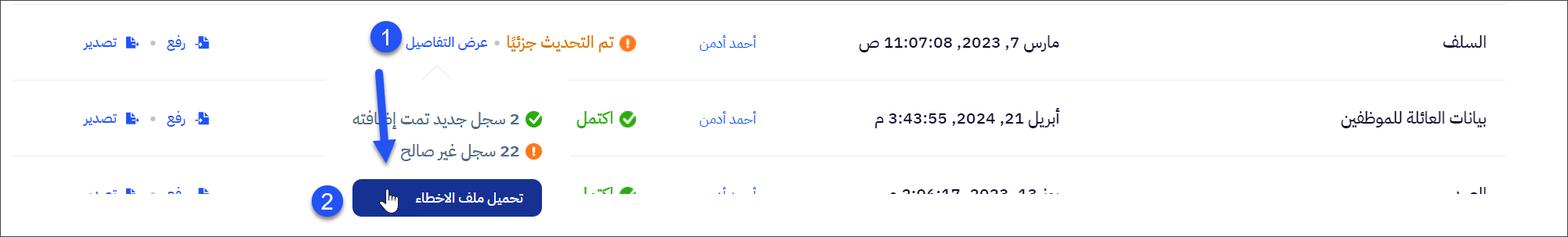 - في حال ظهور الحالة "تم التحديث جزئياً " أو “فشل” يمكنك التعرف على الأخطاء الموجودة في الملف من خلال الضغط على عرض التفاصيل والذي سيظهر لك عدد السجلات غير الصالحة.