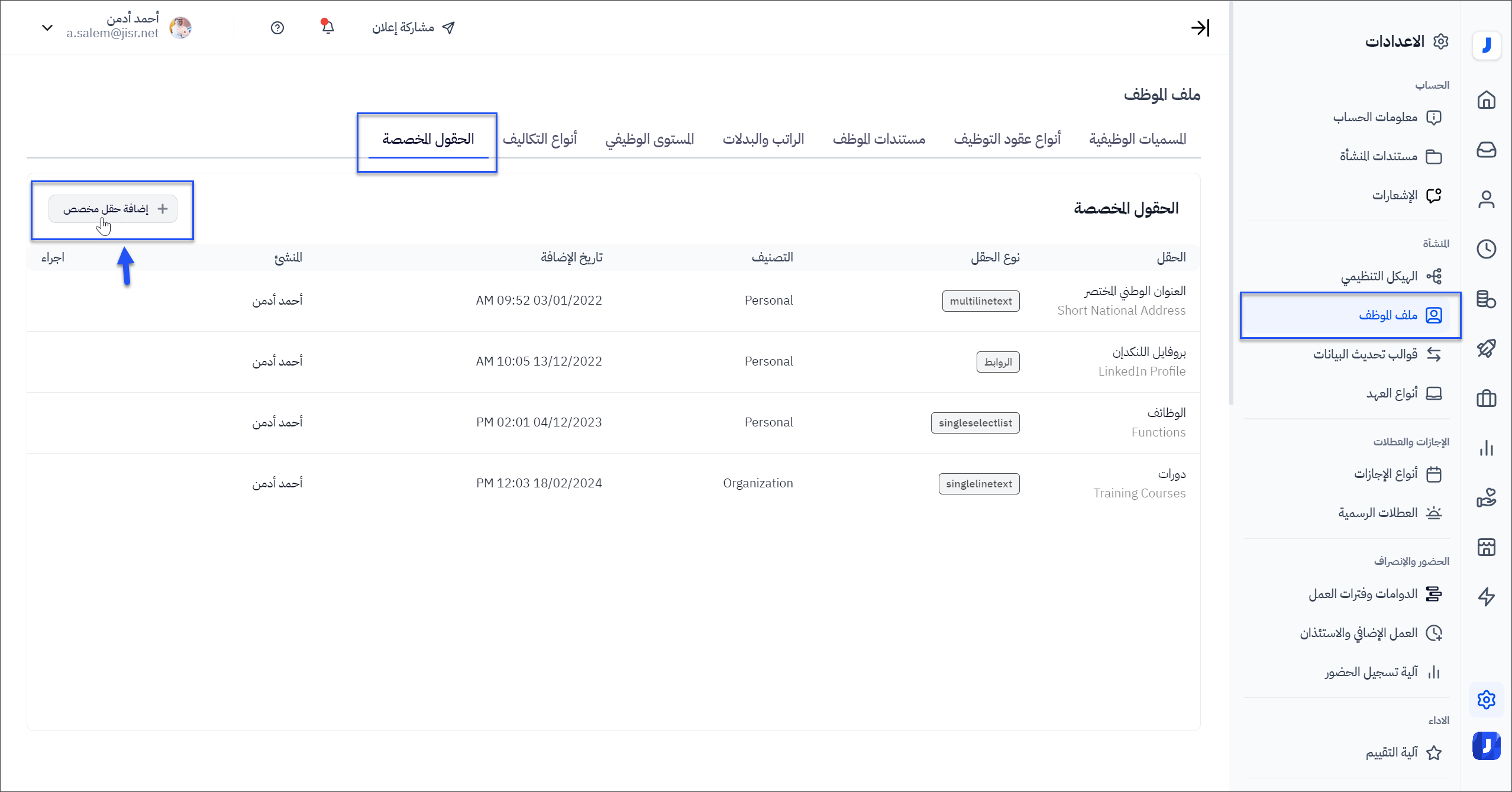 يمكن لمشرف النظام إضافة حقول مخصصة للموظفين باتباع الخطوات التالية: