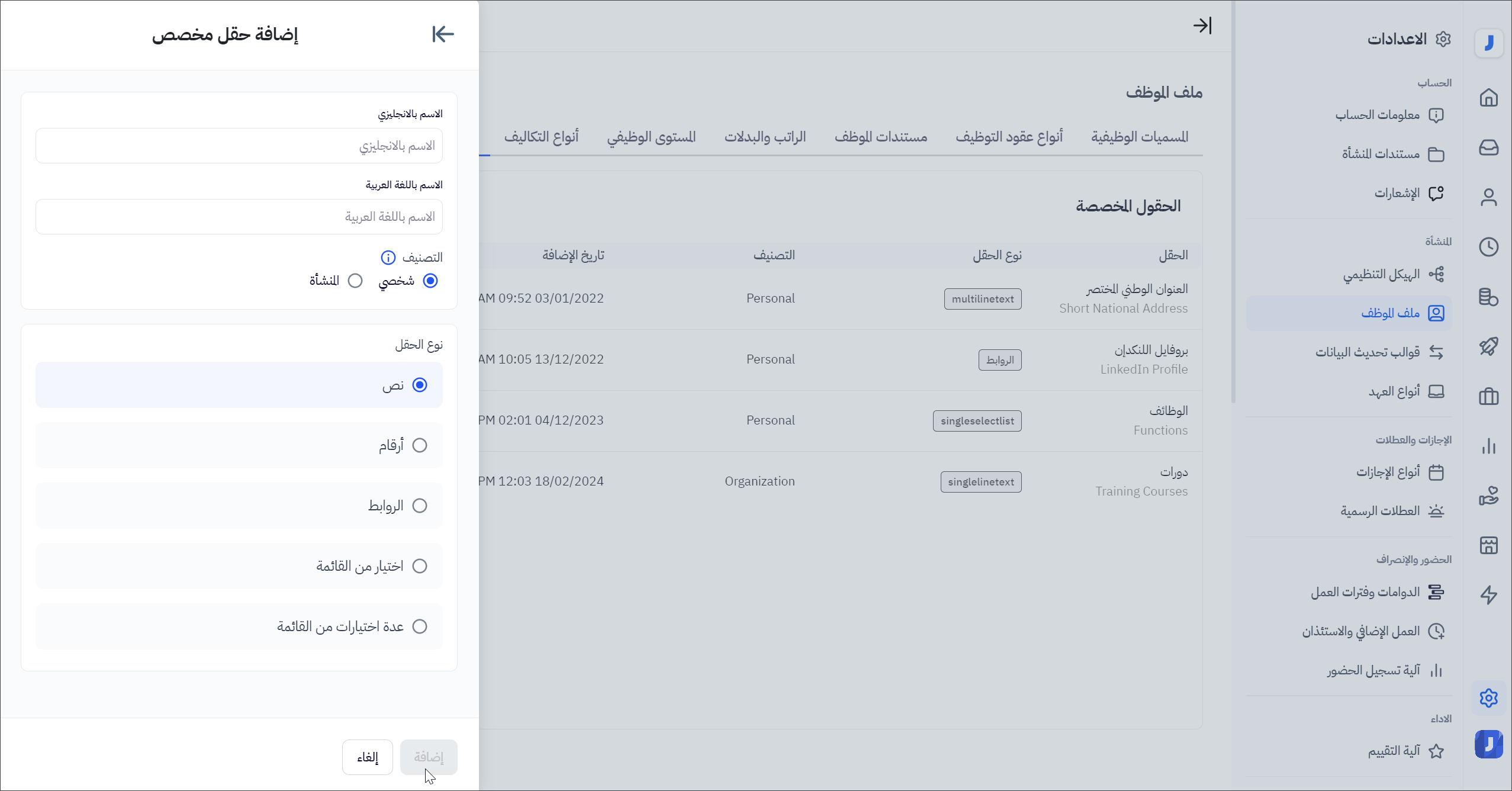 - تأكد من اختيار التصنيف : شخصي أو تابع للمنشأة مما يحدد موقع ظهور هذا النوع من الحقول في ملف الموظف الشخصي ( تبويب شخصي ) أو تبويب المنشأة ( يقصد بها تبويب المعلومات الوظيفية )