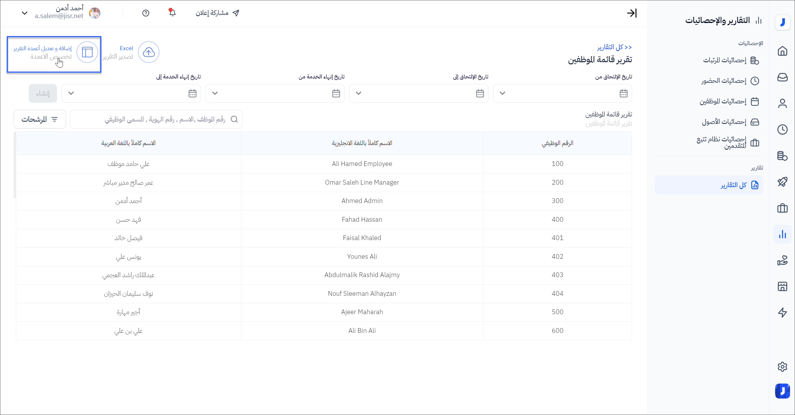 ملاحظة: يمكن لمشرف النظام تصدير تقرير بيانات الحقول المخصصة التي تم تعريفها عن طريق التقارير والإحصائيات > كل التقارير > ( تقرير قائمة الموظفين >إضافة او تعديل أعمدة التقرير.