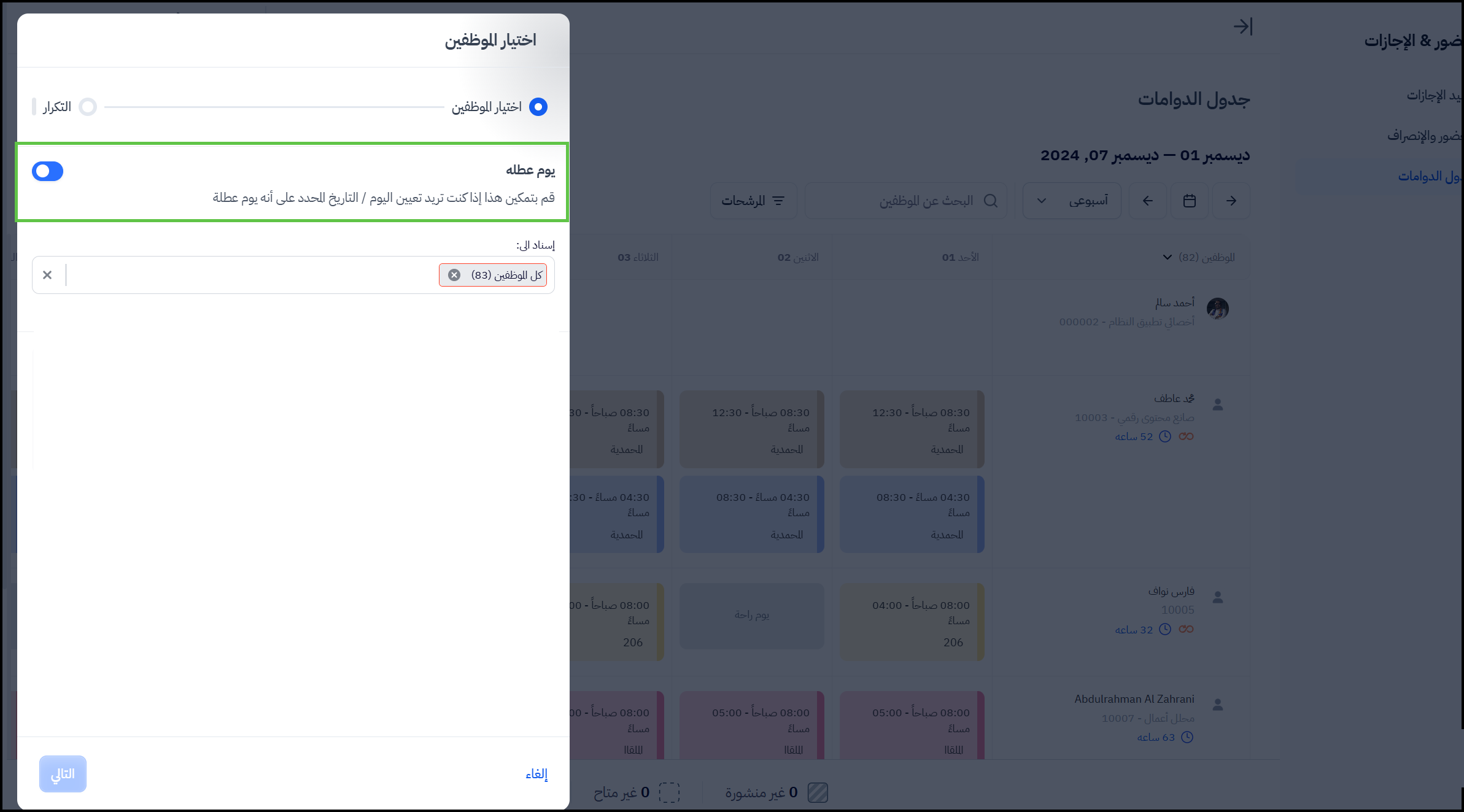 - يقوم المستخدم بعد ذلك بالنقر على التالي ليختار متى يبدأ العمل على هذه الإعدادات واختيار المدة، من خلال تحديد تاريخ البداية وتكرار الدوام إذا أراد المستخدم أن يتم تكرار هذا الدوام الذي تم إسناده لفترة زمنية محددة.