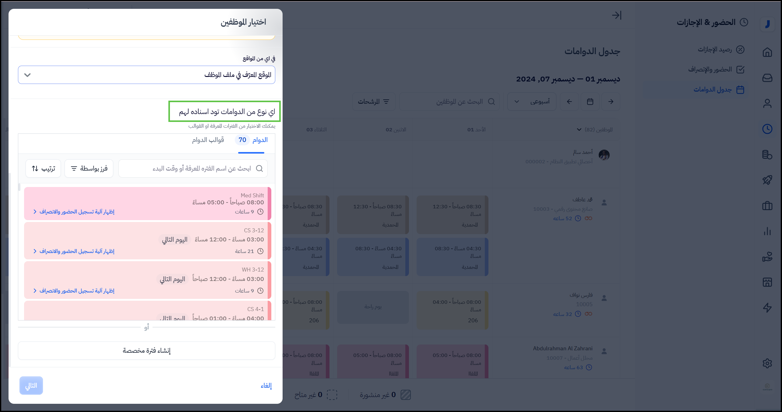 يقوم المستخدم باختيار اي نوع من الدوامات تود اسناده لهم التي تم إنشاؤها مؤخراً أو من جميع الفترات أو من القوالب أو من خلال انشاء فترة مخصصة جديدة.