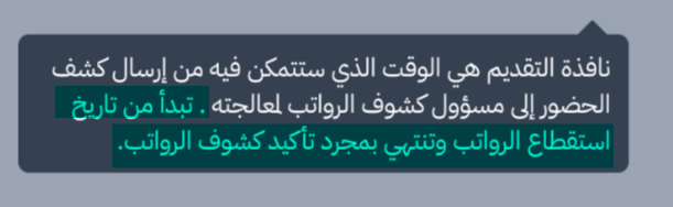 ملاحظة مهمة: سيتمكن المسؤول من اعتماد الكشف خلال الفترة المسماة بنافذة التقديم والمقصود فيها: الفترة التي تبدأ من تاريخ الاستقطاع المحدد للشهر الحالي للراتب الذي ينبغي معالجة بياناته و تنتهي بمجرد التأكيد على مسير الرواتب من قبل الشخص صاحب الصلاحية على نظام جسر: