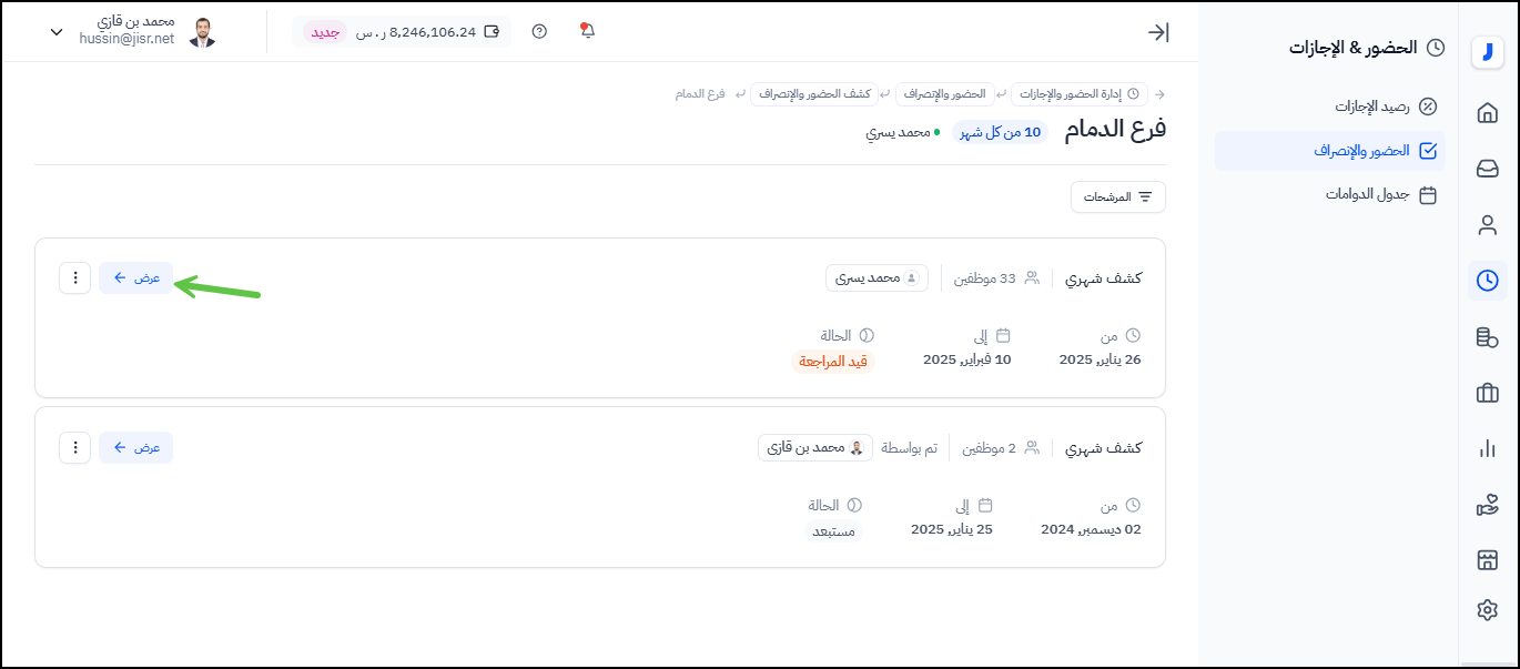 من الممكن لمدير الحضور والانصراف من استعراض و مراجعة سجل حضور وانصراف جميع الموظفين. من خلال اتباع الخطوات التالية :