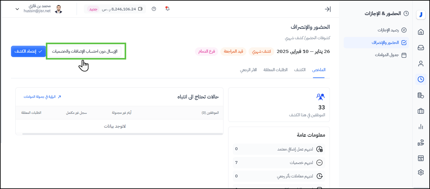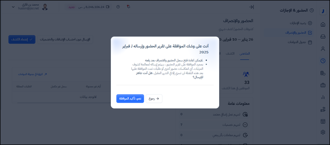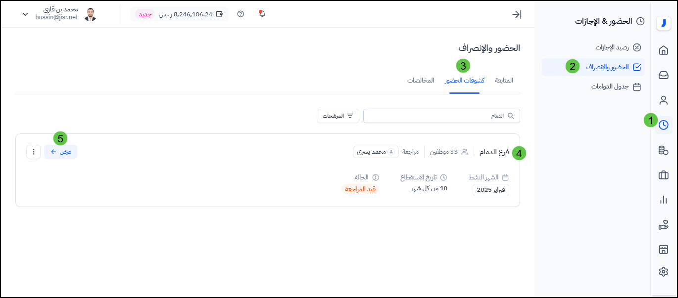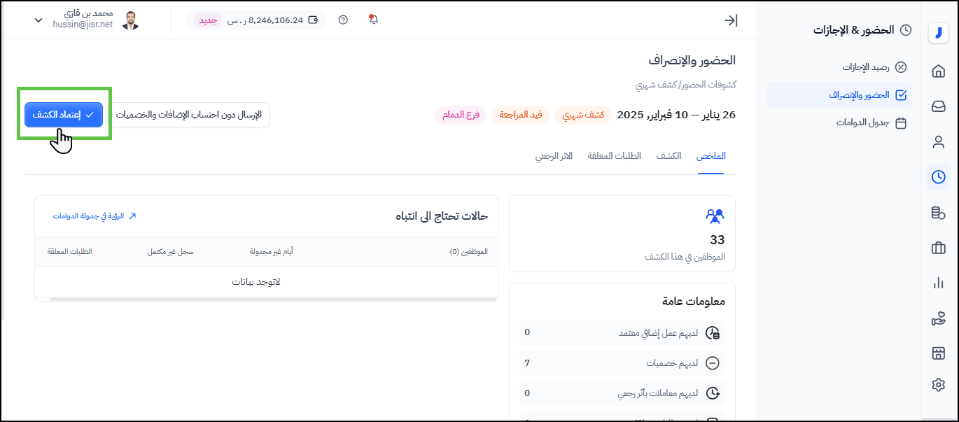استعراض ومراجعة واعتماد كشف الحضور والانصراف للموظفين :