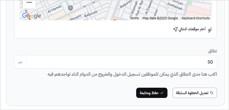 4- اختر الموقع المطلوب من قائمة مواقع العمل للمنشأة والتي تم تعريفها مسبقا في النظام، ومن الخريطة قم بتحديد موقع العمل الذي تم اختياره بشكل دقيق ثم قم بتحديد الدائرة المحيطة بالموقع، والتي يسمح للموظف بتسجيل الحضور أو الانصراف من خلالها.