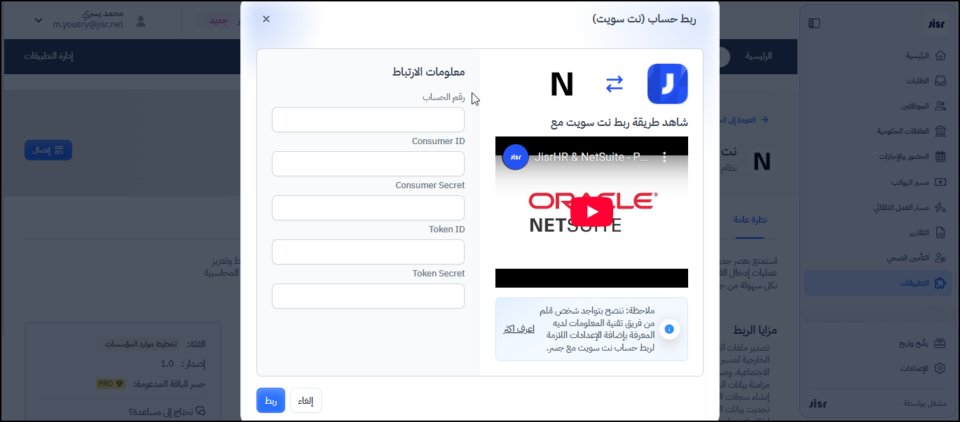 تفعيل الربط بين نظام جسر و الـ Netsuite يساهم في تقليل الأعمال اليدوية التي تتم لتجهيز القيود اليومية من قبل أقسام المالية ، وذلك عن طريق أتمتة عمليات إنشاء القيود وإرسالها من جسر إلى النت سويت، و كذلك مزامنة جميع المعاملات المالية والمخصصات ، و مزامنة بيانات الموظفين بين النظامين.