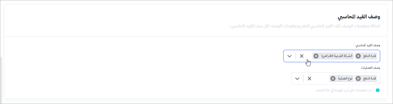 بإمكان المسؤول تخصيص عرض وظهور الوصف الخاص بملف القيود اليومية والسطر الخاص بالقيد المحاسبي عن طريق إختيار المعلومات المطلوب ظهورها .