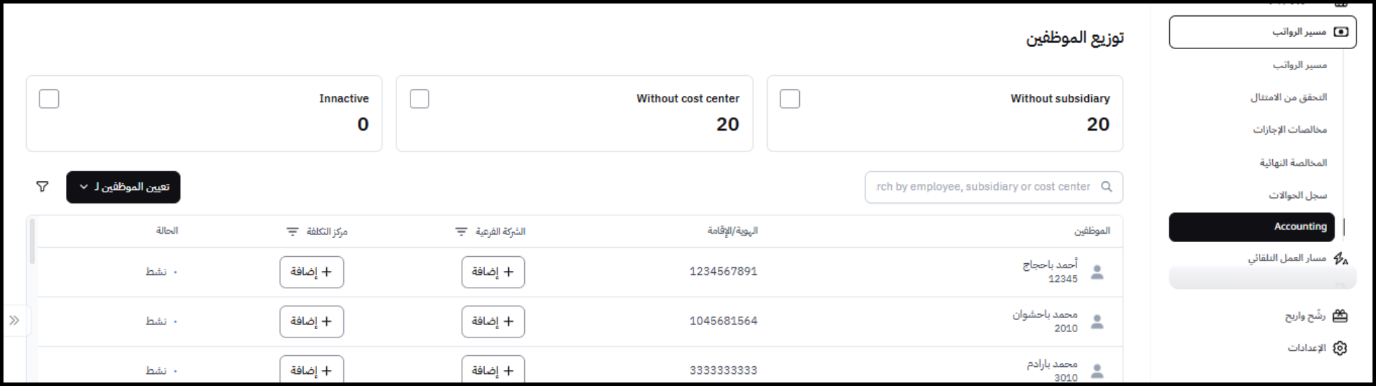 في هذه الخطوة بإمكان المسؤول معاينة ومراجعة الشكل النهائي لتوزيع الموظفين على مراكز التكلفة ( إن وجدت ) لغرض التأكد من عدم نسيان إضافة أحد الموظفين أثناء عملية الإعداد والربط التي تمت.