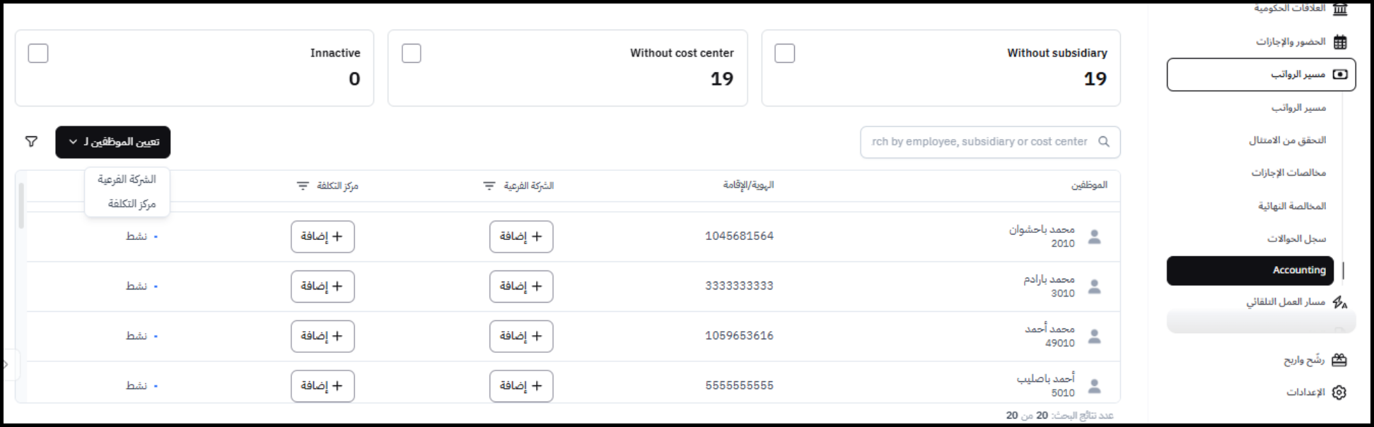 في هذه الخطوة بإمكان المسؤول معاينة ومراجعة الشكل النهائي لتوزيع الموظفين على مراكز التكلفة ( إن وجدت ) لغرض التأكد من عدم نسيان إضافة أحد الموظفين أثناء عملية الإعداد والربط التي تمت.