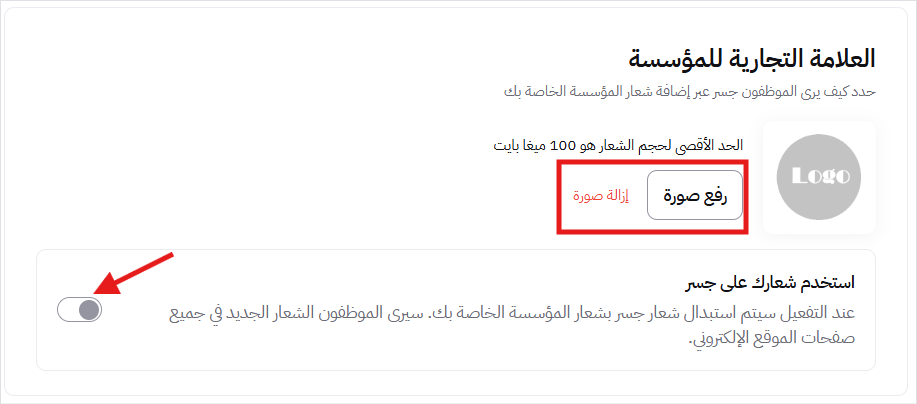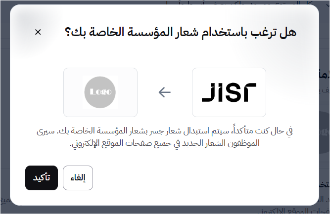 وعند تفعيله، تظهر رسالة تأكيد تشرح أن شعار شركتك سيتم عرضه بدلأ من شعار جسر لجميع الموظفين في كل الصفحات.