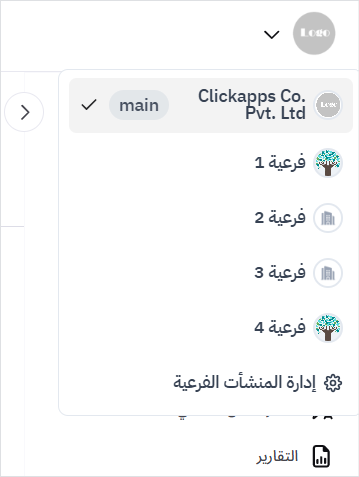 بالنسبة لأصحاب صلاحية "مشرف النظام والشركات الفرعية"، يتم تلقائيًا استخدام شعار كل شركة عند اختيارها، بدلاً من شعار جسر. كما ستظهر شعارات الشركات في قائمة الشركات الفرعية عند فتحها كالتالي.