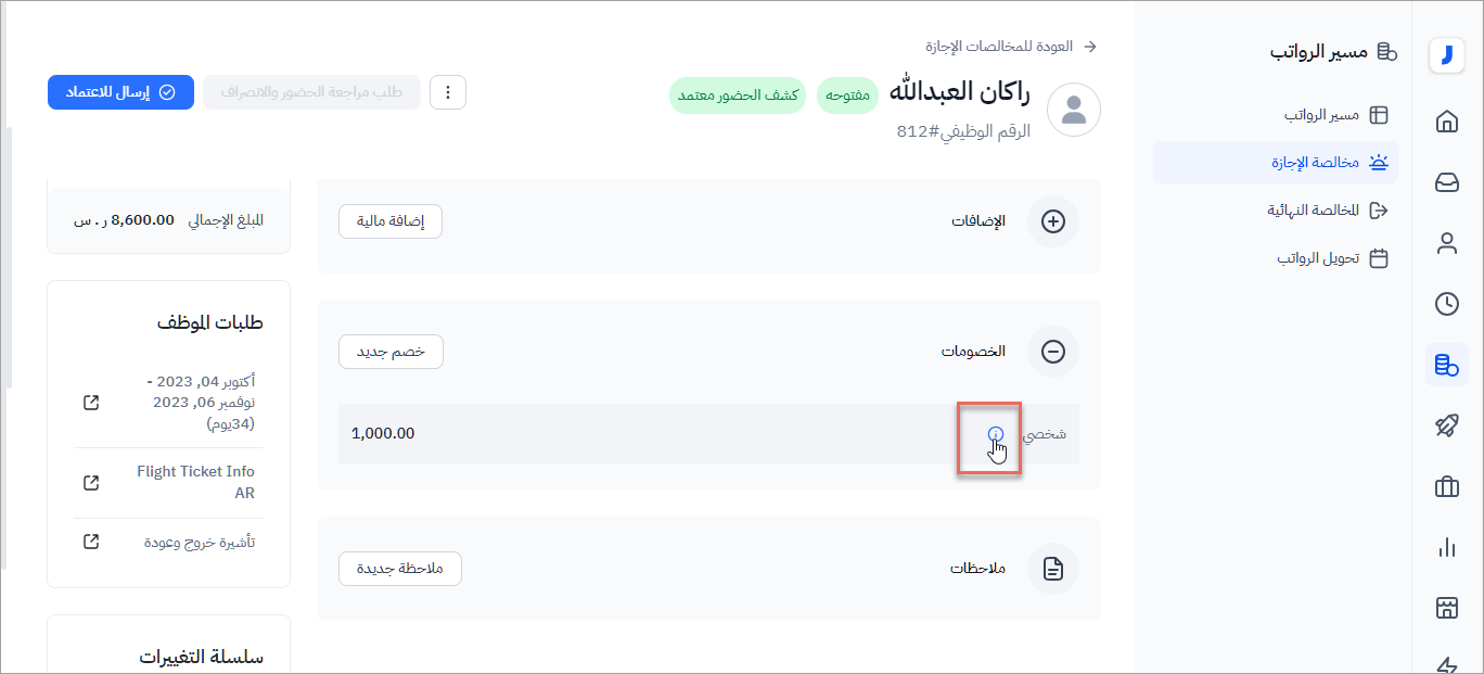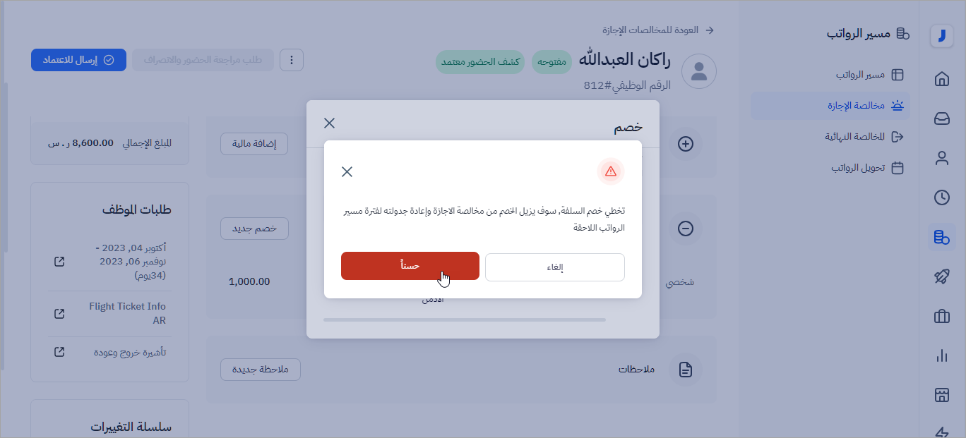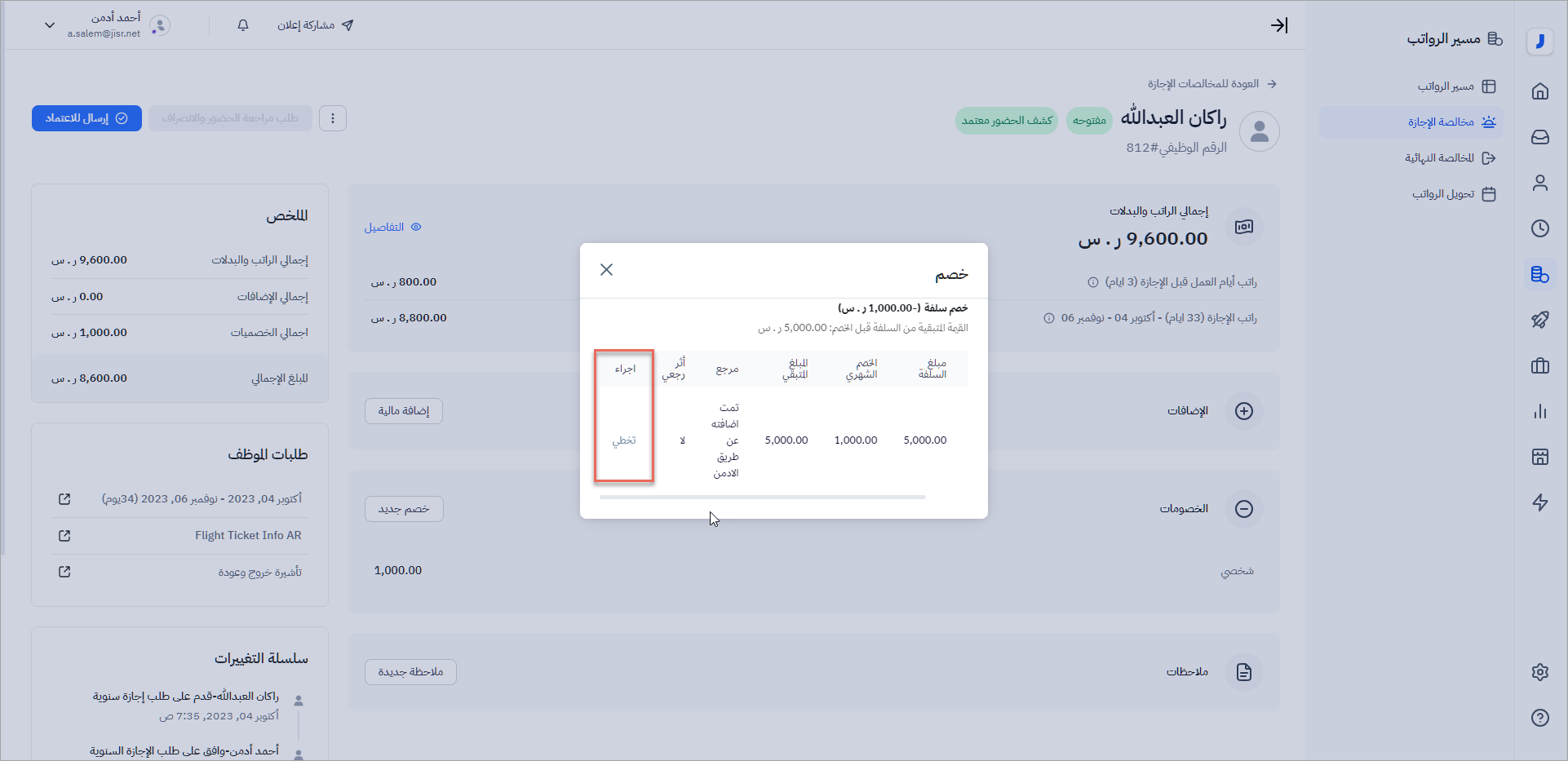 ويمكن لمسؤول الموارد البشرية من عمل تخطي لخصم القسط الشهري الخاص بالسلفة و عدم تضمينها ضمن مخالصة الإجازة من داخل المخالصة نفسها ، عن طريق النقر على الأيقونة ( ! ) مقابل نوع السلفة ضمن القسم ( الخصومات ).