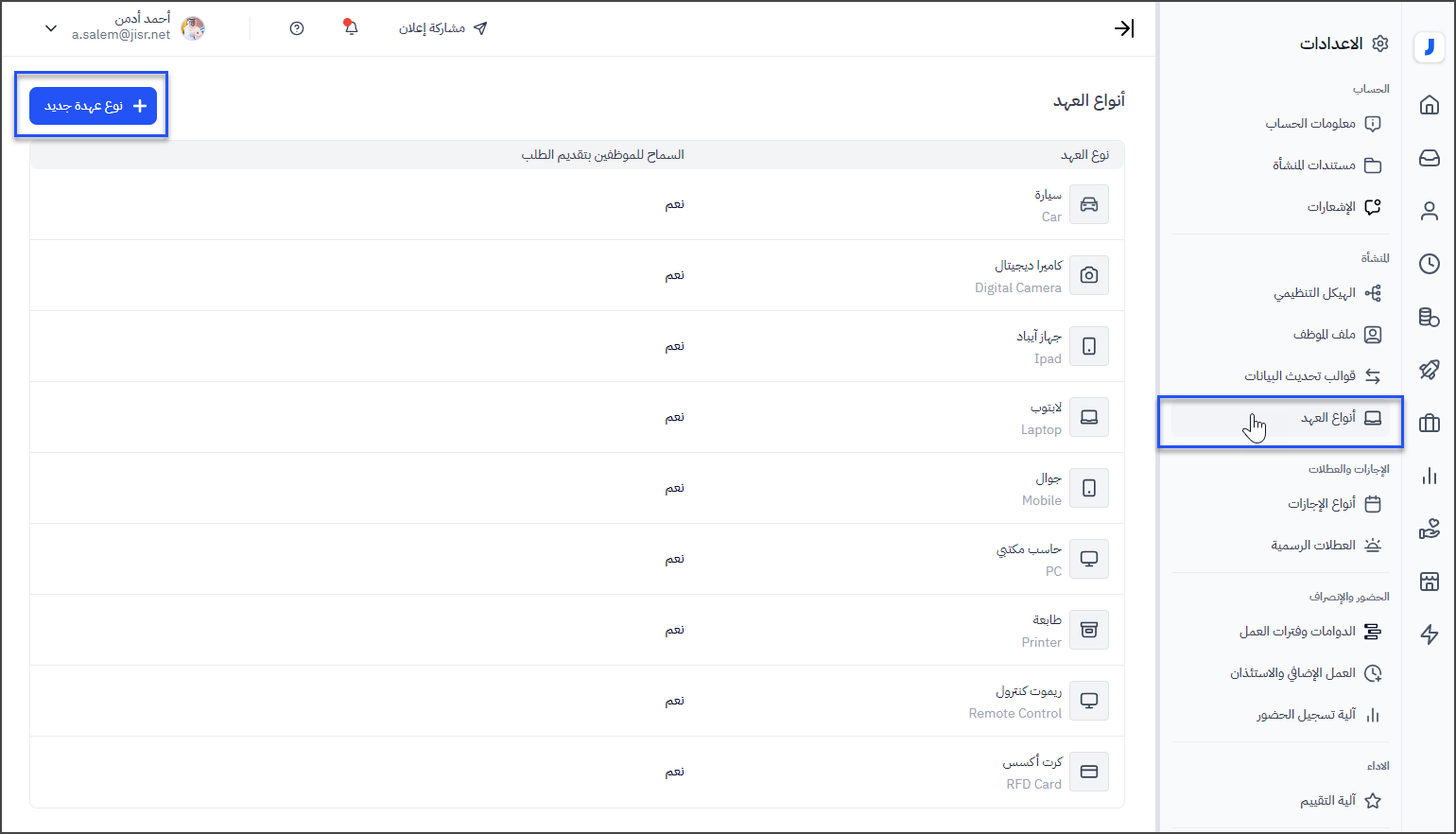 الإعدادات > المنشأة > أنواع العهد > إضافة نوع عهدة جديد