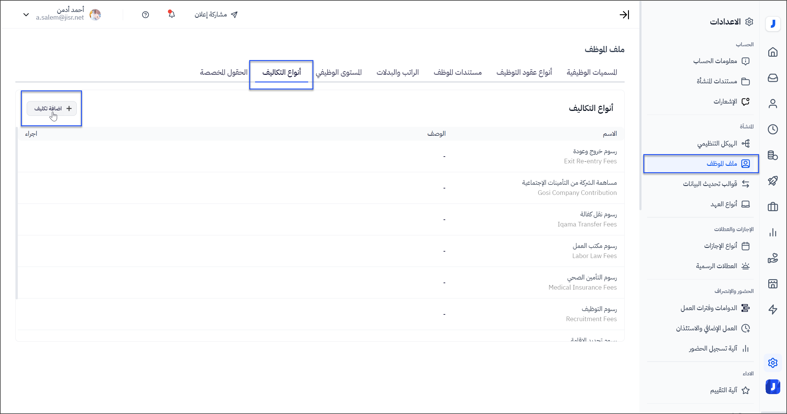 يمكن لمشرف النظام أو الشخص صاحب الصلاحية من إضافة تفاصيل التكلفة لكل نوع من الأنواع التي تم تعريفها من خلال ملف الموظف الشخصي.