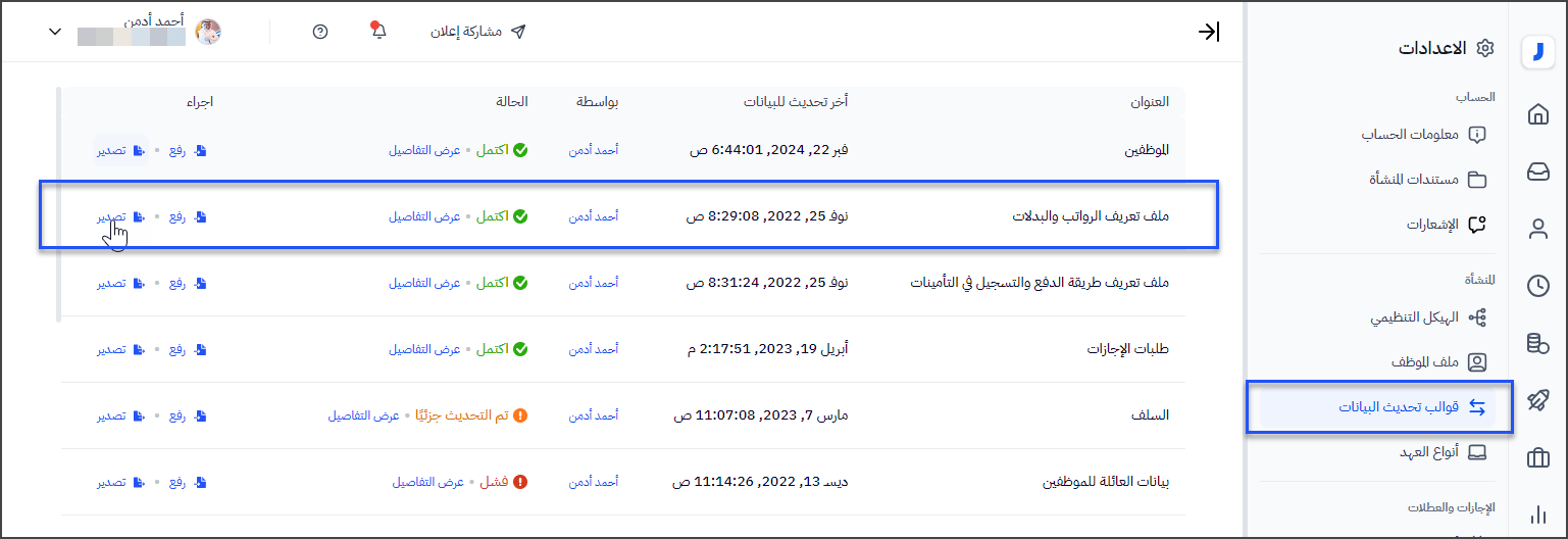 من الصفحة الرئيسية - ومن القائمة الجانبية على اليمين اختر ( الإعدادات ) > قوالب تحديث البيانات > الموظفين > تصدير.