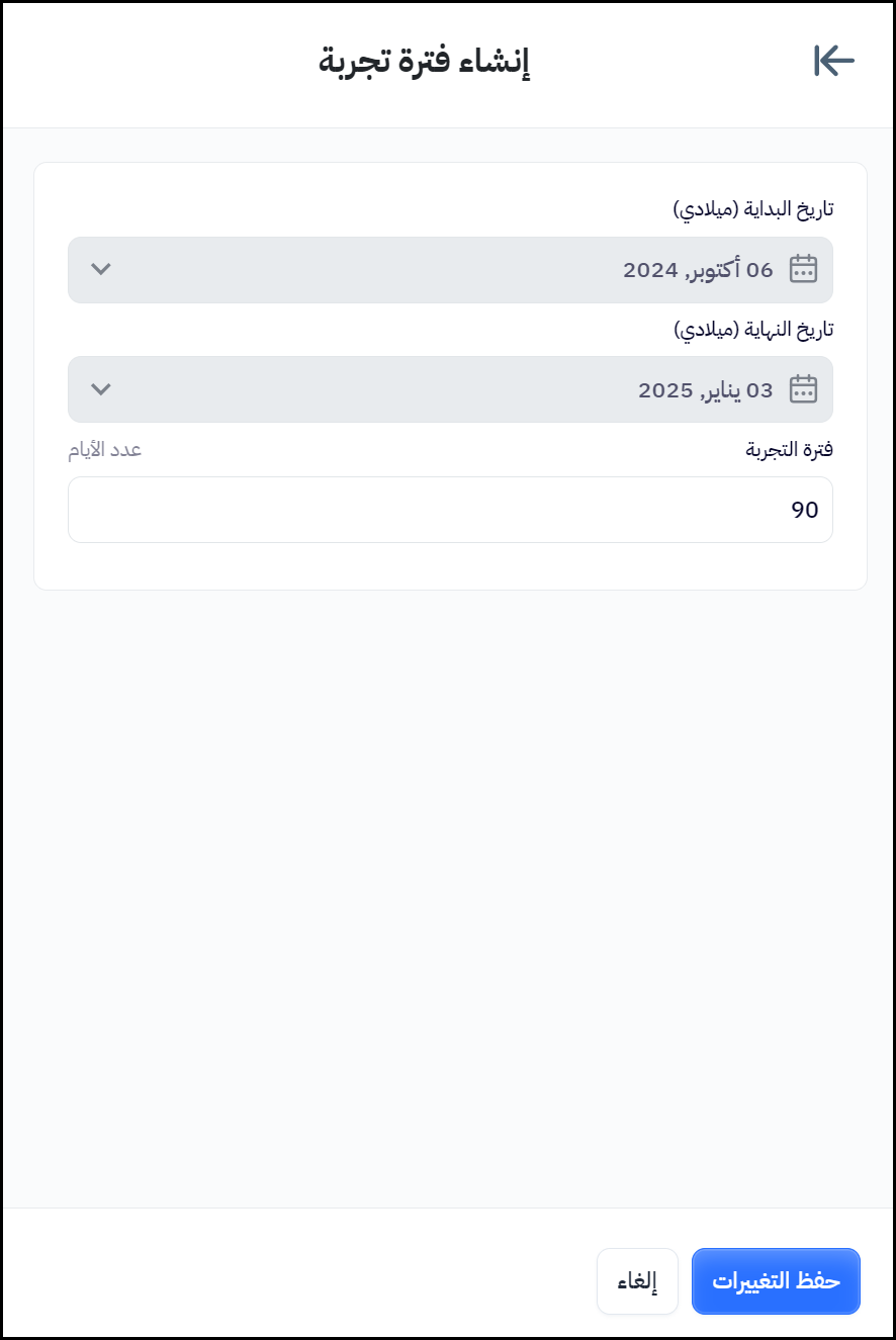 6- قم بتحديد عدد أيام فترة التجربة ( الافتراضي 90 يوم قابلة للتمديد لمدة لا تزيد عن 180 يوماً ).