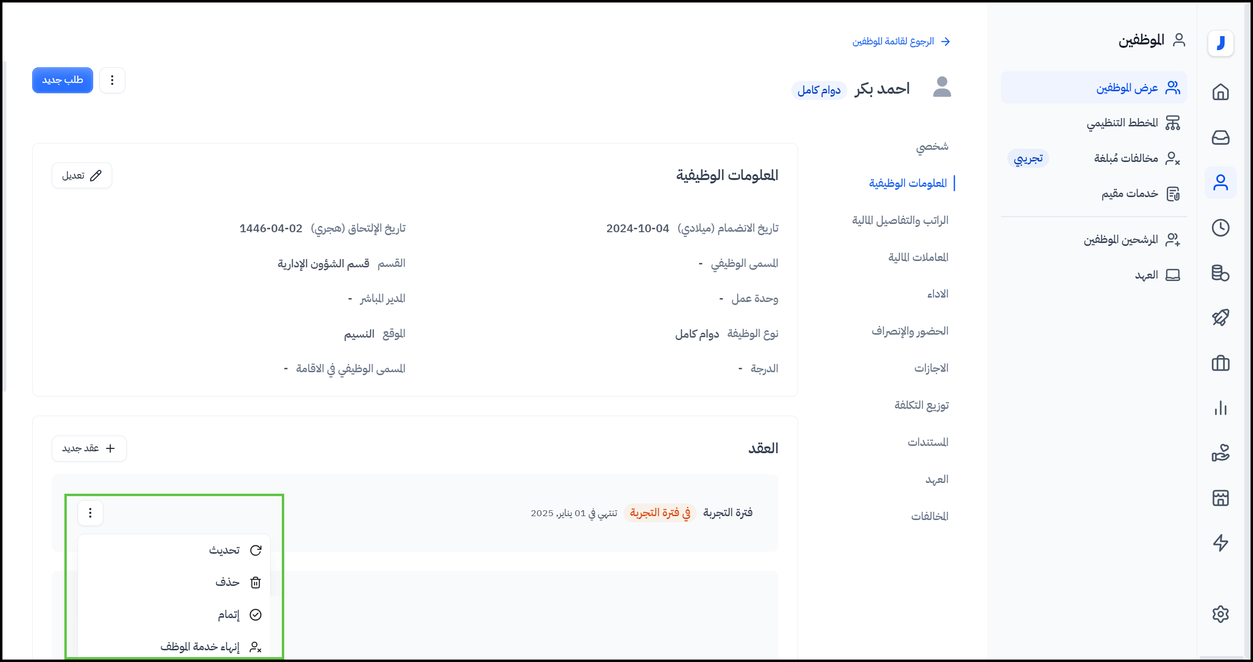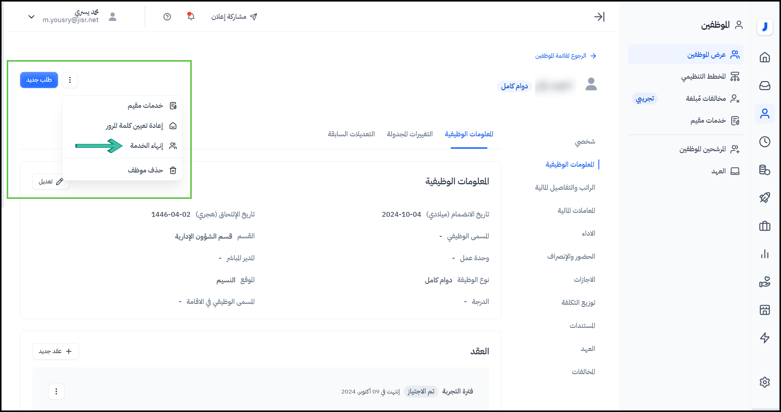 يمكن للأدمن من انهاء عقد موظف خلال فترة التجربة في حال انتهاء العلاقة بين الطرفين ، وذلك باتباع الخطوات التالية: -