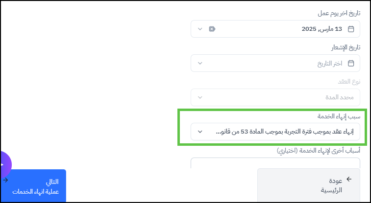 يجب أن يتم اختيار سبب إنهاء العلاقة بين الطرفين بشكل صحيح من قائمة أسباب إنهاء العقد :