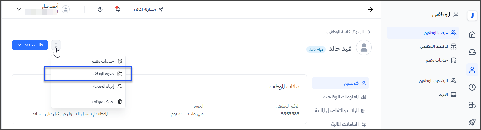 2- لا يظهر زر دعوة الموظف في حال لا توجد لديك صلاحية تعديل على بيانات الموظف او لم يتم تسجيل أو إضافة بريد الكتروني في ملف الموظف الشخصي.
