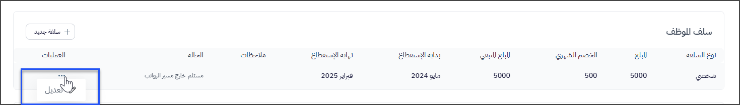 2- كما يمكن إضافة تسوية جزئية أو كاملة على مبلغ السلفة المتبقي أو جدولة السلفة المضافة مسبقاً ( تخطي خصم لأشهر معينة أو عدم التخطي أو تغيير مبلغ الخصم الشهري ) عن طريق خيار (تعديل).