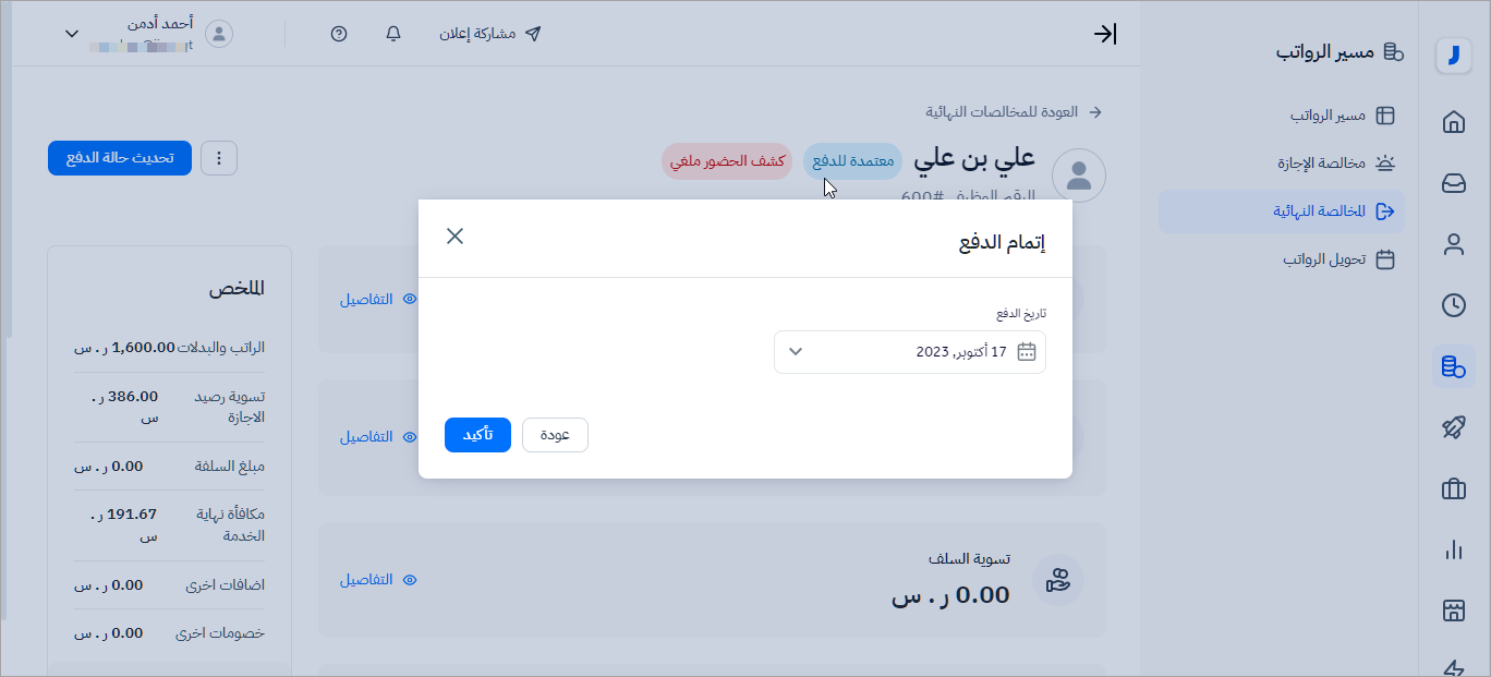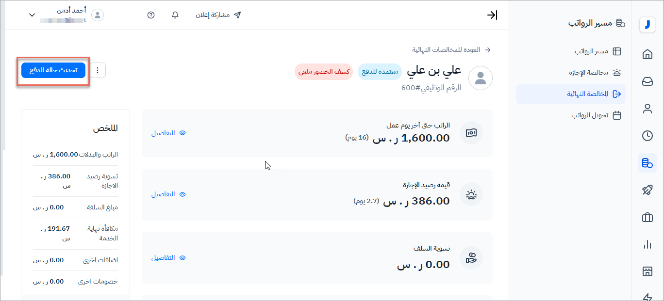 - قم بالذهاب إلى التبويب الخاص بالمخالصة النهائية >> البحث عن الموظف المطلوب وعرض المخالصة ( من خلال النقر على عرض التفاصيل ).