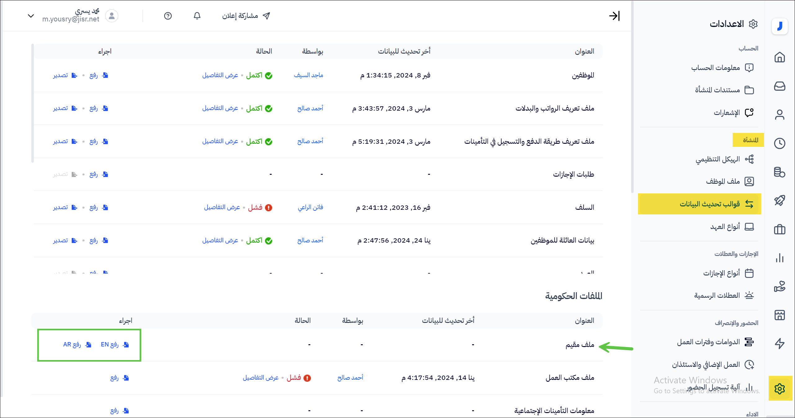 عن طريق قيام الأدمن بالذهاب إلى صفحة الإعدادات >إعدادات الشركة > قوالب تحديث البينات > قسم الملفات الحكومية > ملف مقيم > رفع AR ( في حال توفر نسخة ملف مقيم بالعربي ) > رفع En ( في حال توفر نسخة ملف مقيم بالإنجليزي ).