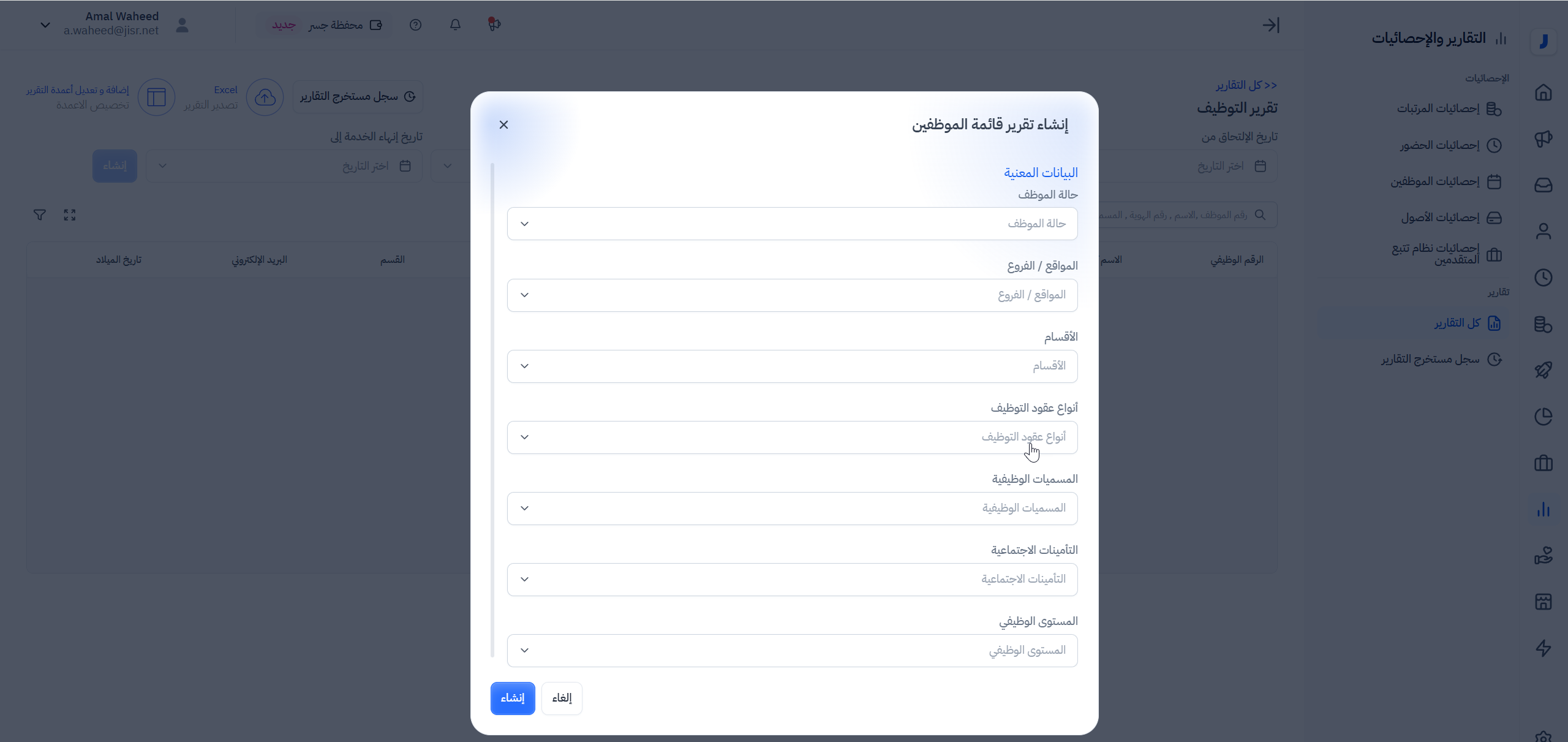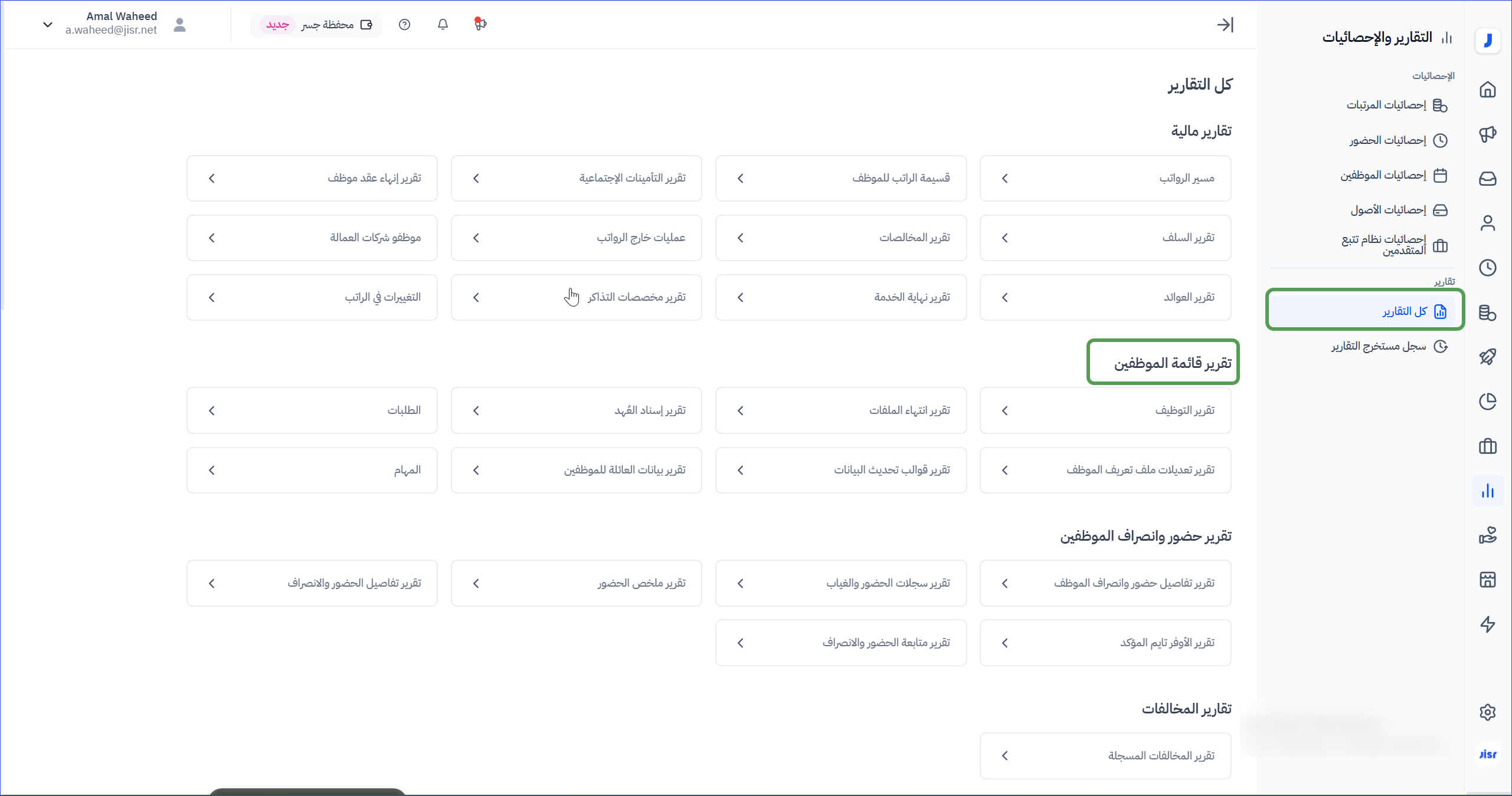 يمكن الوصول لتقارير قائمة الموظفين من خلال الذهاب إلى التقارير > كل التقارير > تقرير قائمة الموظفين