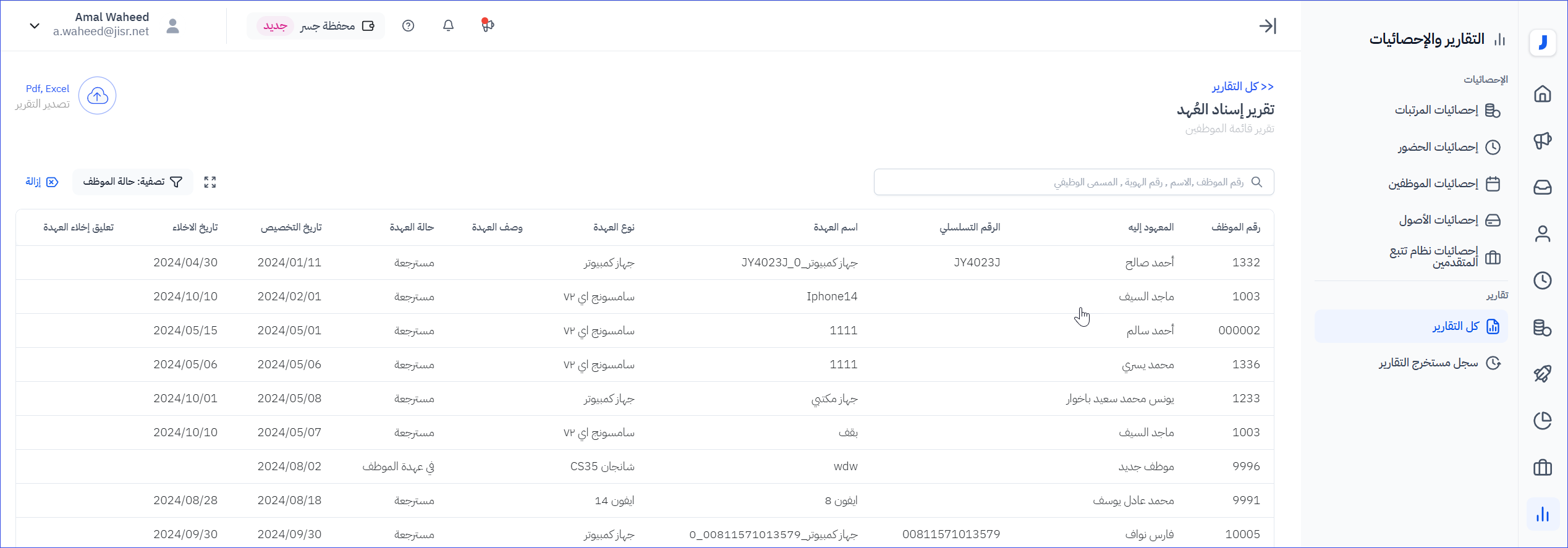 يستعرض هذا التقرير جميع العهد العينية للموظفين المسجلة على النظام ويستعرض البيانات التالية:
