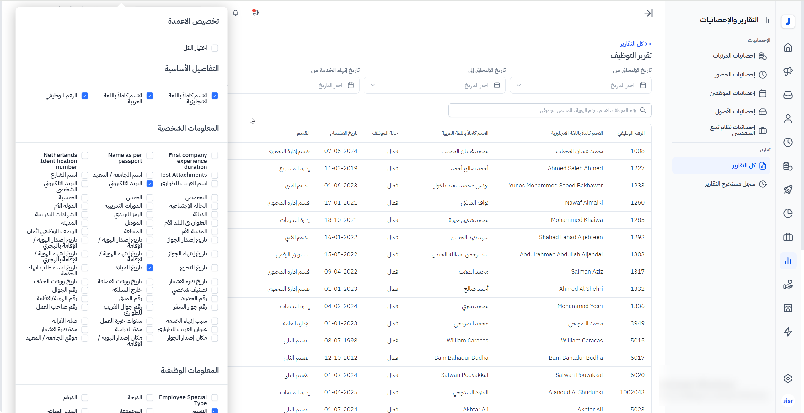 يعرض هذا التقرير تفاصيل قائمة الموظفين الذين تمت إضافتهم على النظام ( سواء النشطين أو غير النشطين ) وتفاصيل بياناتهم ( الشخصية والوظيفية والمالية ) ، بحيث يتم اختيارها قبل إنشاء التقرير ، كذلك يمكن إستخدام خيارات البحث بين تواريخ الإلتحاق او تواريخ إنهاء الخدمات ، مع توفر خيارات البحث وتخصيص المعلومات والفرز في التقرير قبل التصدير .