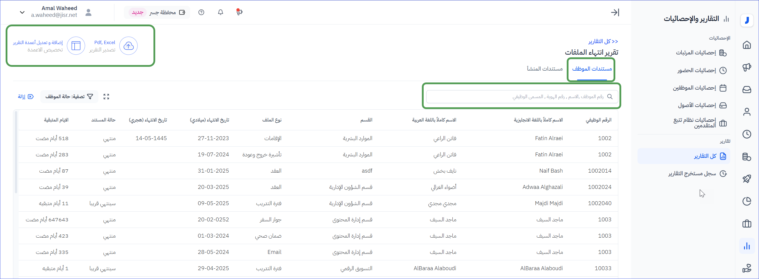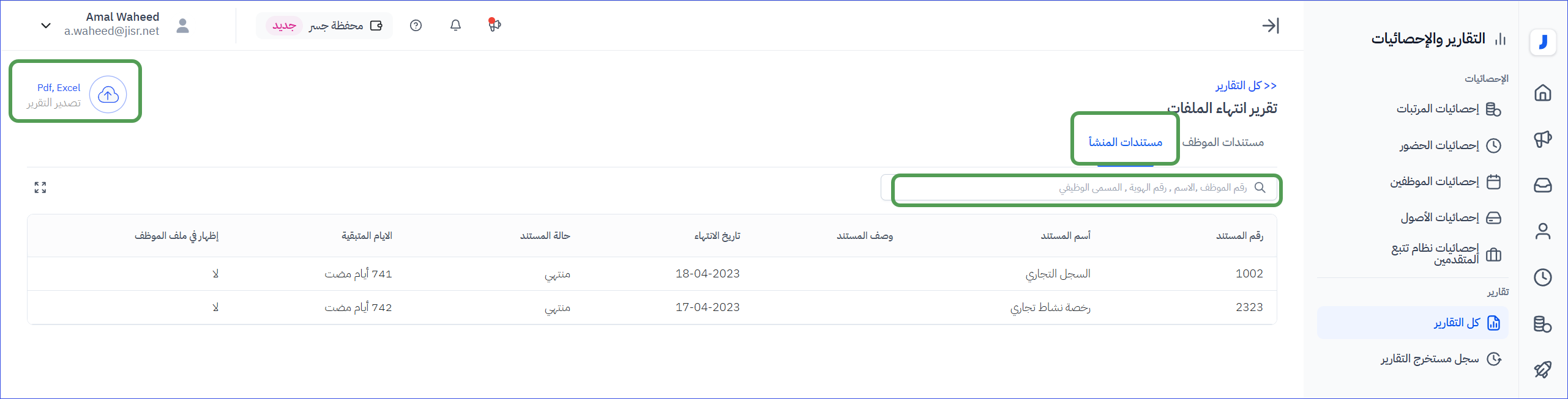 يستعرض هذا التقرير تفاصيل مستندات الموظفين ومستندات الشركة المنتهية أو التي أوشكت على الإنتهاء ، مع توفر خيارات البحث والفرز وتخصيص الأعمدة في التقرير قبل التصدير أو الطباعة .