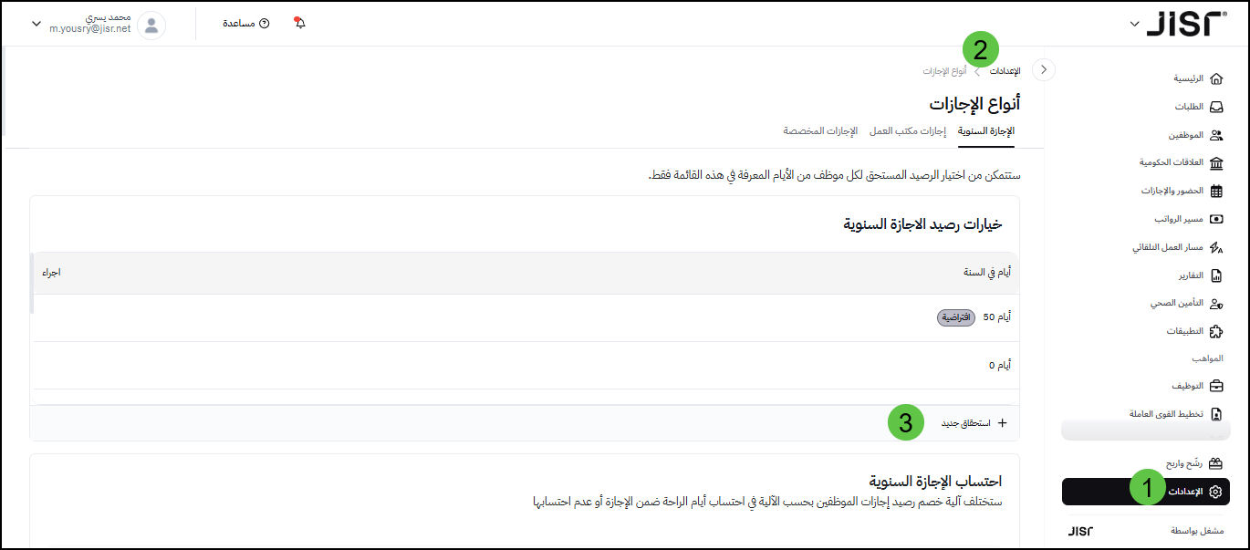 من الصفحة الرئيسية > الإعدادات > أنواع الإجازات > الإجازة السنوية > خيارات رصيد الإجازة السنوية > إضافة استحقاق جديد