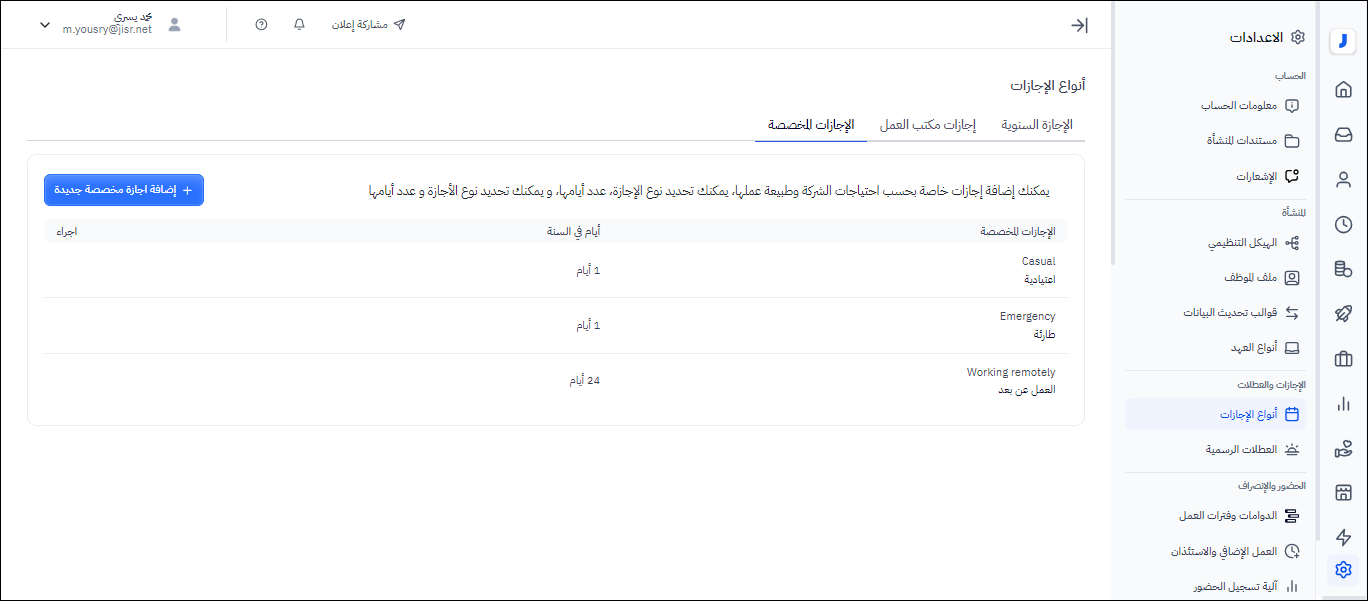 في حال وجود إجازات خاصة بالمنشأة يتم منحها للموظفين بموجب سياسة معينة ، فبإمكان الأدمن من إضافة إجازات خاصة بحسب سياسة الشركة وطبيعة عملها، باتباع الخطوات التالية :
