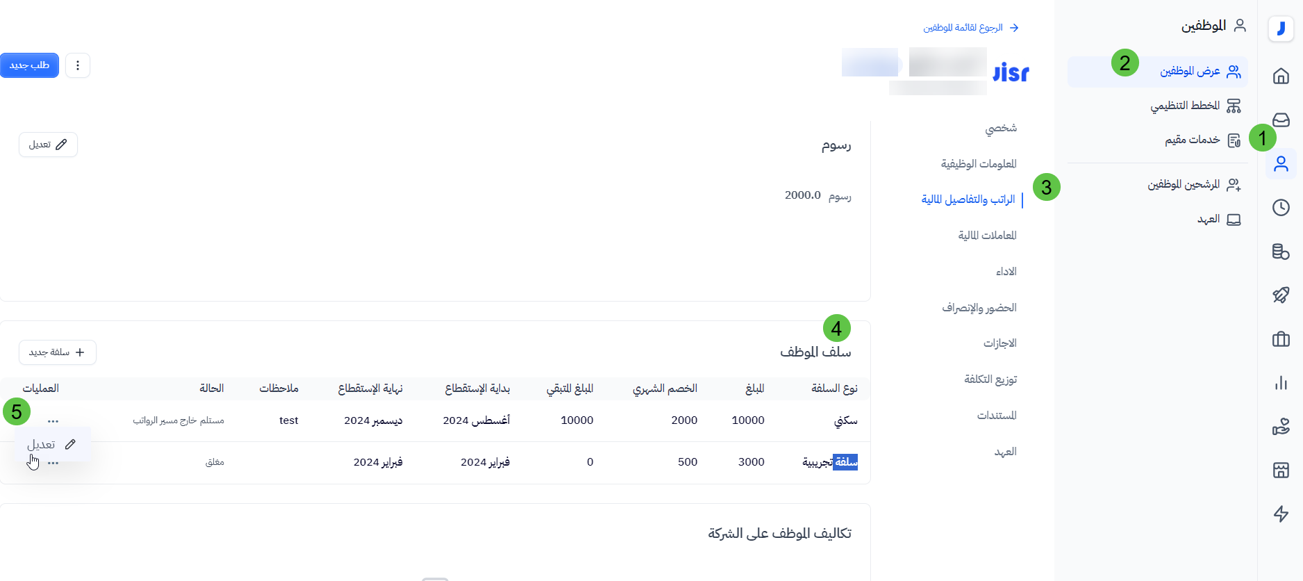 - في حال الرغبة بتغيير مبلغ الخصم الشهري لشهر محدد فقط أو أكثر وليس لكافة الأشهر ، قم بالانتقال الى تبويب جدولة السلفة ، والضغط على الـ … ثم اختيار تغيير مبلغ الخصم.