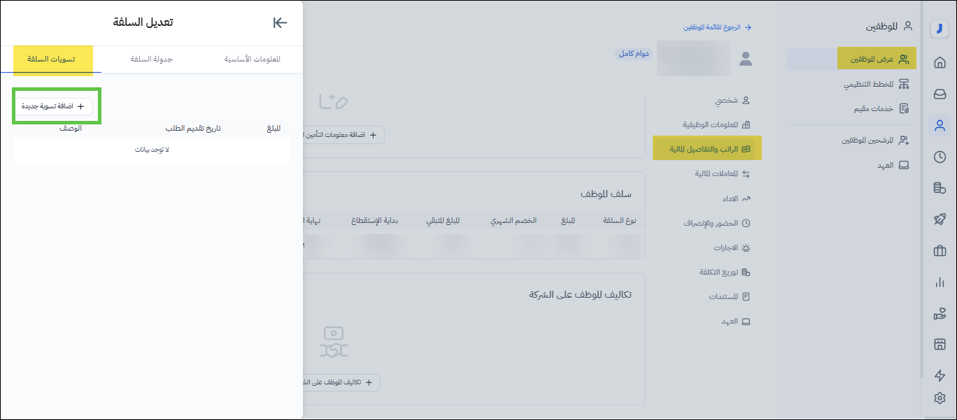 قد يواجه المسؤولون في قسم الموارد البشرية أو المالية ، أحياناً حالات تستدعي عمل تسوية للسلفة ( تسوية مالية ) للسلفة المسجلة على الموظف بالرغم من أن هذه السلفة قد تم سداد أقساط منها في شهور ماضية عبر مسير الرواتب ..