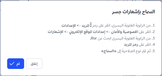 لاستلام الإشعارات الخاصة بنظام جسر في متصفح الجهاز الخاص بالمستخدم ( نسخة الويب ) فيلزم القيام بالتالي :