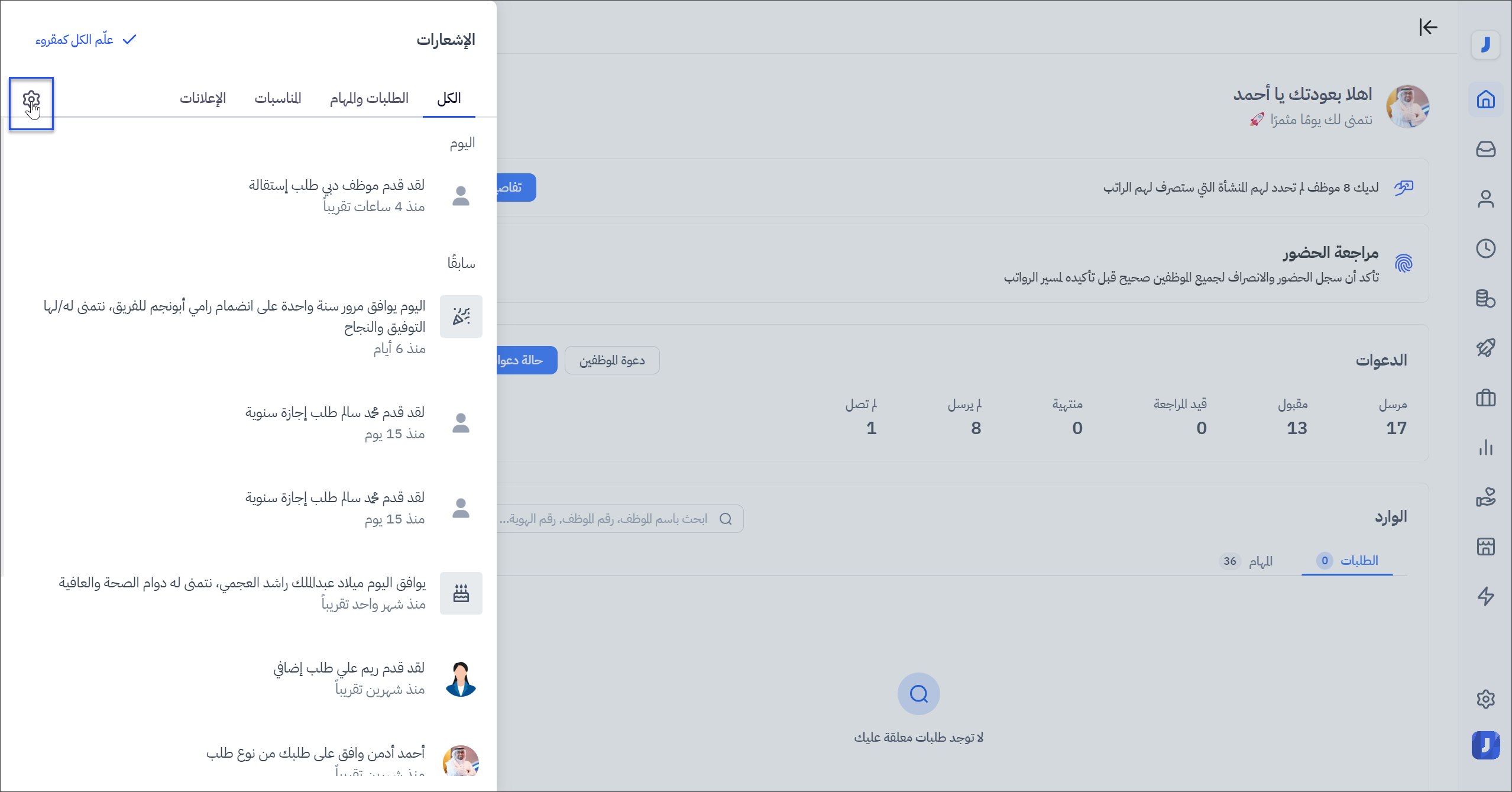 2- من النافذة الجانبية الخاصة بالإشعارات ، قم بالنقر على أيقونة ( الإعدادات )