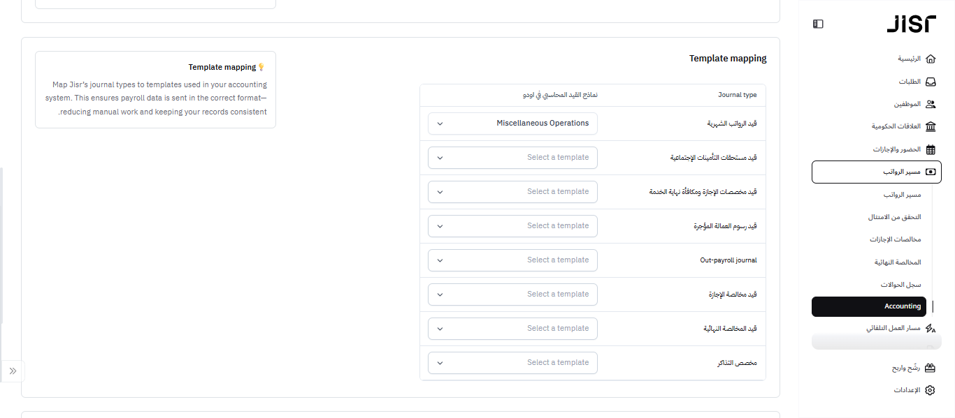 بإمكان المسؤول من تحديد و ربط القيود المحاسبية بجسر بنموذج واحد ( قالب ) القيد المحاسبي في أودو أو عدة نماذج ( إن وجدت )