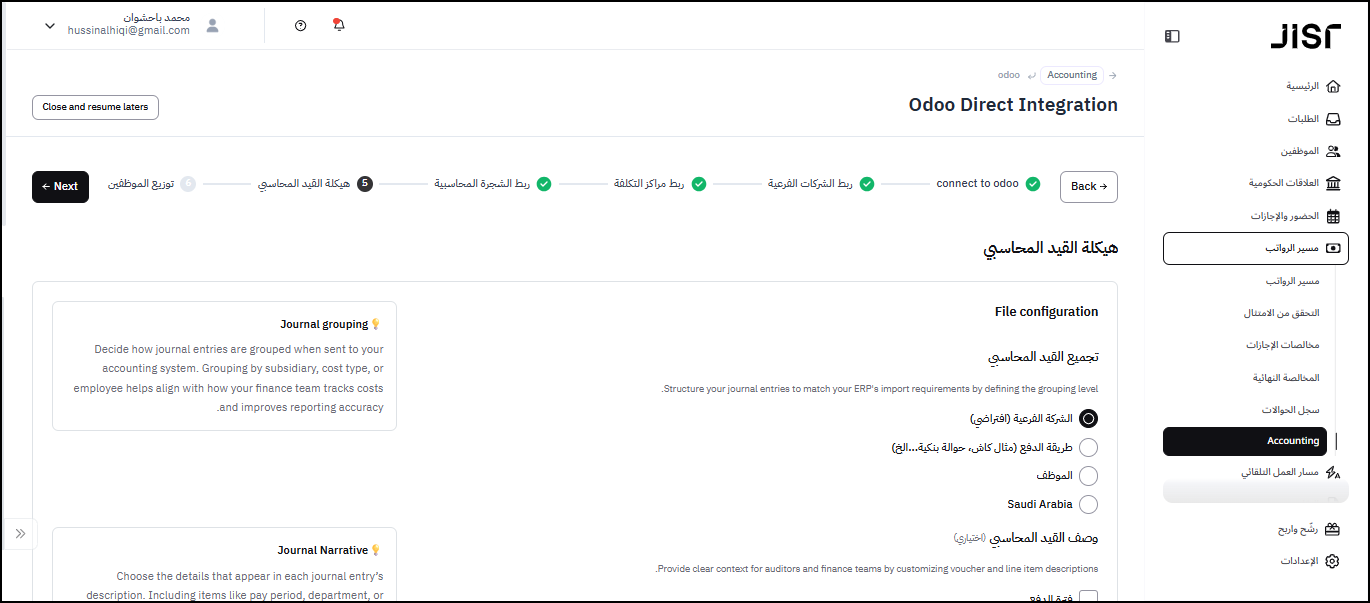في هذه الخطوة ، يلزم على المسؤول تحديد طريقة عرض القيد المحاسبي ( الشكل النهائي لقيود اليومية ) بحيث تكون عبارة عن مجاميع أو بشكل تفصيلي لكل شركة فرعية أو لكل مركز تكلفة ( إن وجد ) أو على مستوى الموظف أو بناء على طريقة الدفع.