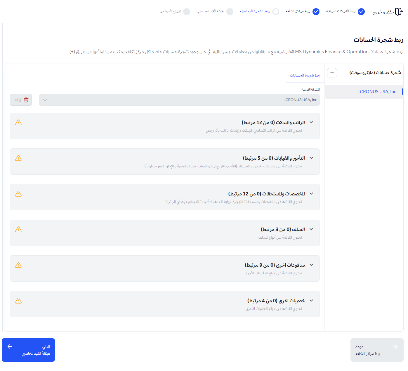 في هذه الخطوة ، يستلزم ربط شجرة حسابات مايكروسوفت الافتراضية مع ما يقابلها من معاملات جسر المالية.